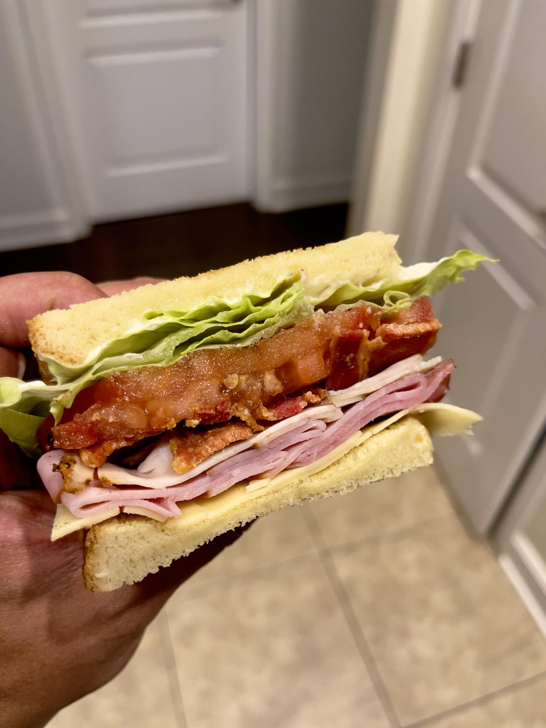 Virginia Ham, Cajun turkey, cherrywood smoked bacon on potato bread with pepper jack and Dukes mayo of course!