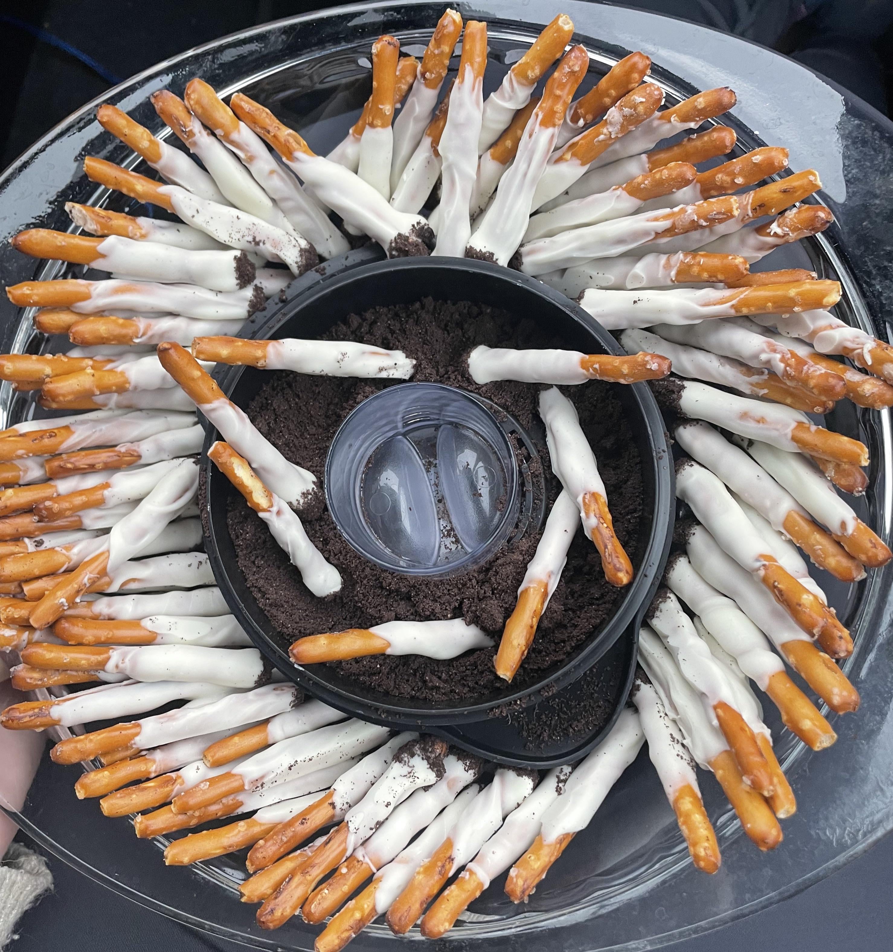 Pretzels covered with cream, and the middle is… Oreo dust?