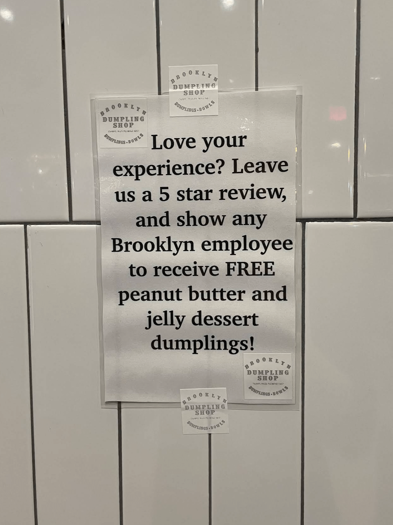 Brooklyn Dumpling on 6th – Horrible, overpriced bland noodles. Was confused why all the reviews were so great for such an obvious lackluster experience – then I noticed this sign they had up. It’s all fake.