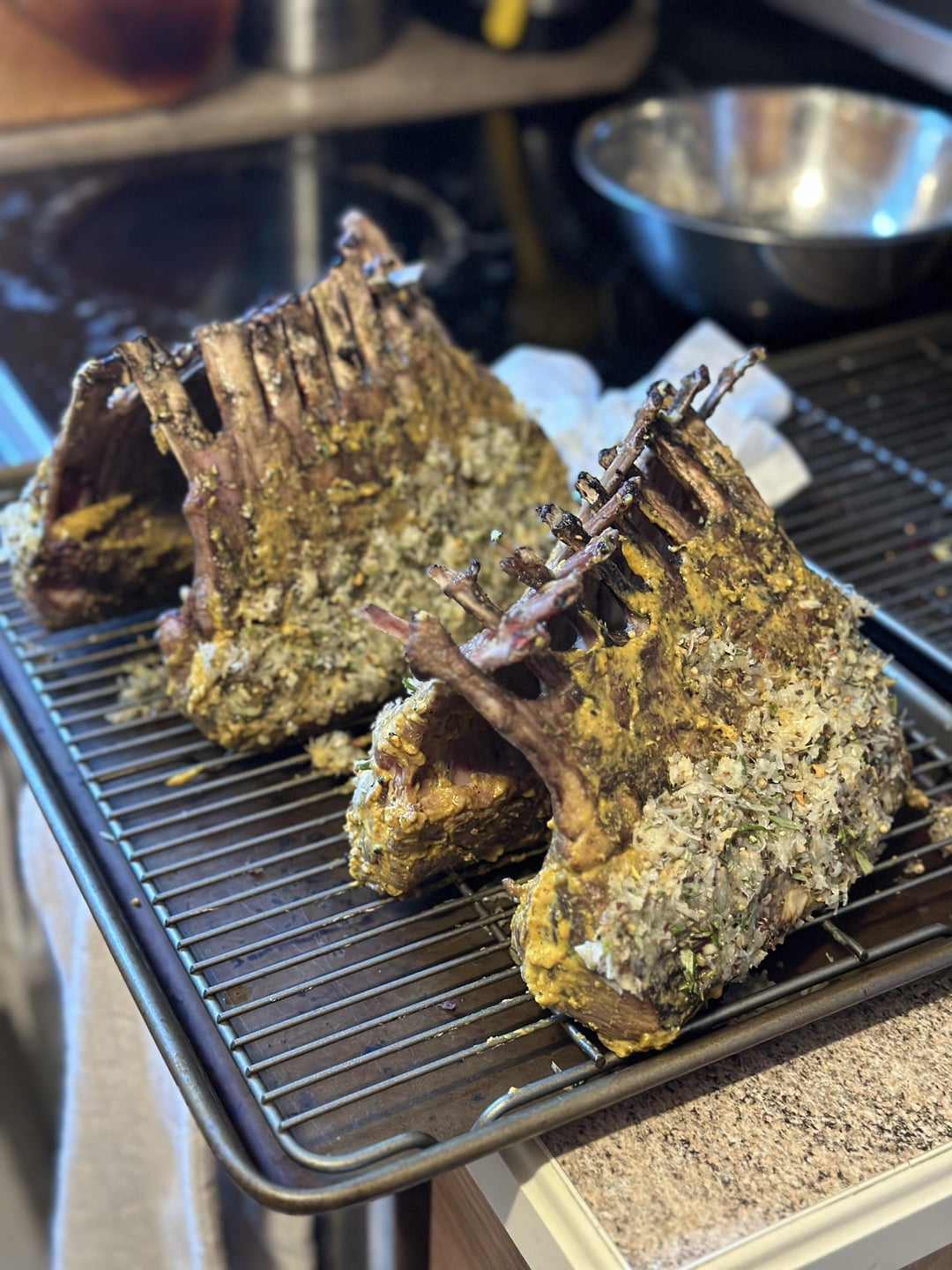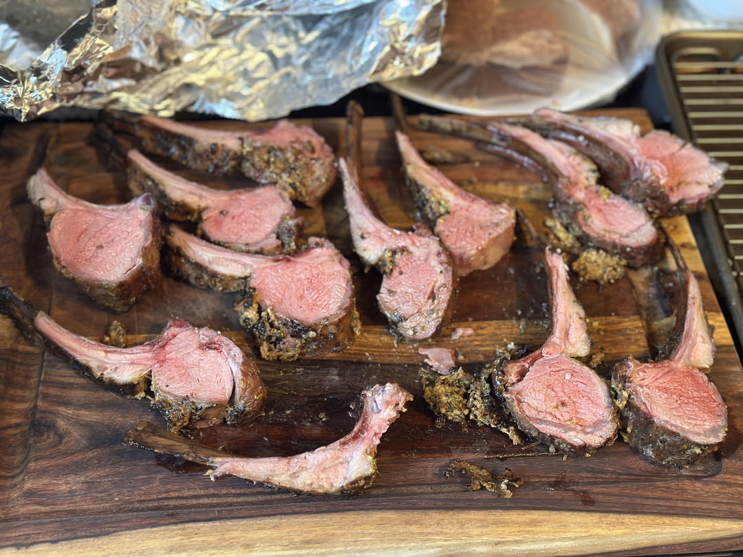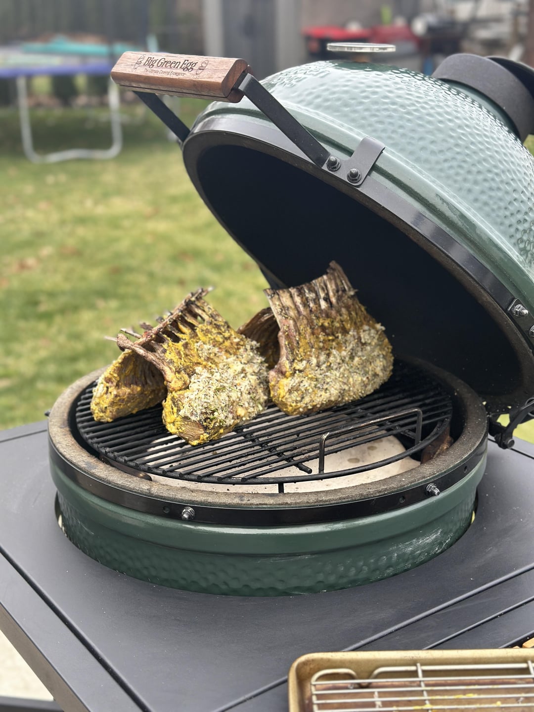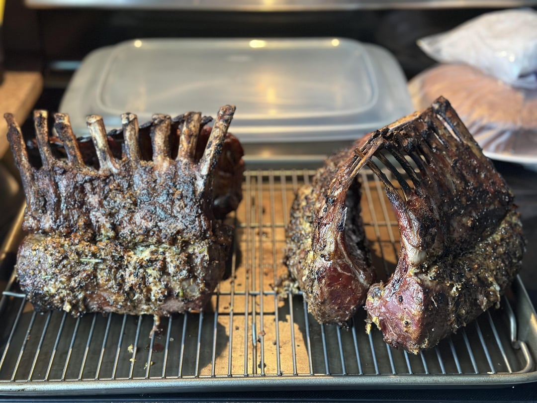 Seasoned with SPG and let sit for about an hour. Quick sear then let rest while I made and put the Parmesan herb rub on it. That included fresh grated Parmesan with rosemary and thyme with some prime rib rub seasoning and fresh garlic with olive oil. I did use a mustard blend as a binder( French’s yellow, stone ground and a Bavarian sweet) Then smoked with a small piece of apple wood at 300 degrees for about 45 minutes. Everyone loved it.