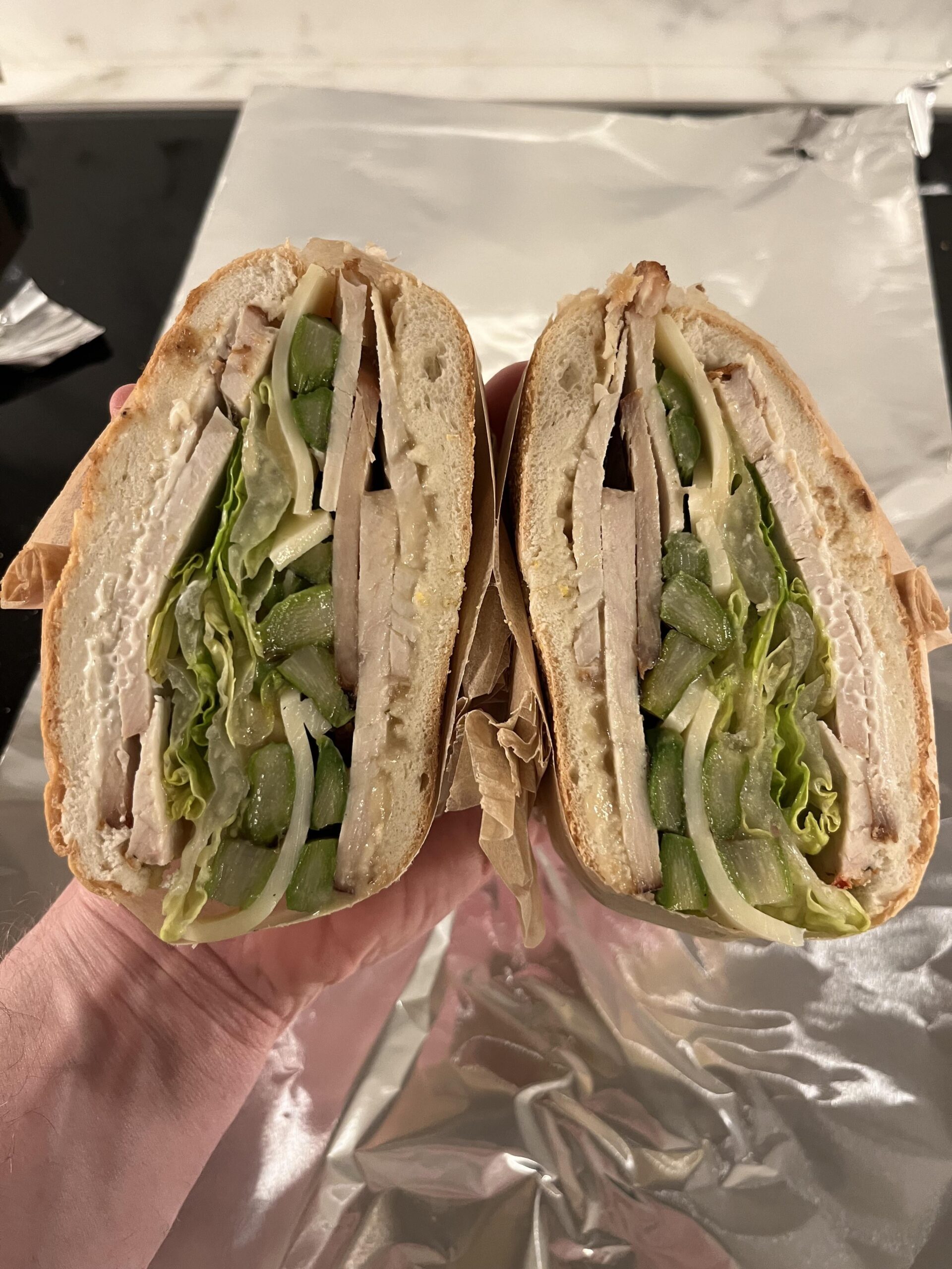 Dry turkey, lots of gravy, asparagus, lettuce, cheese from the cheese plate.