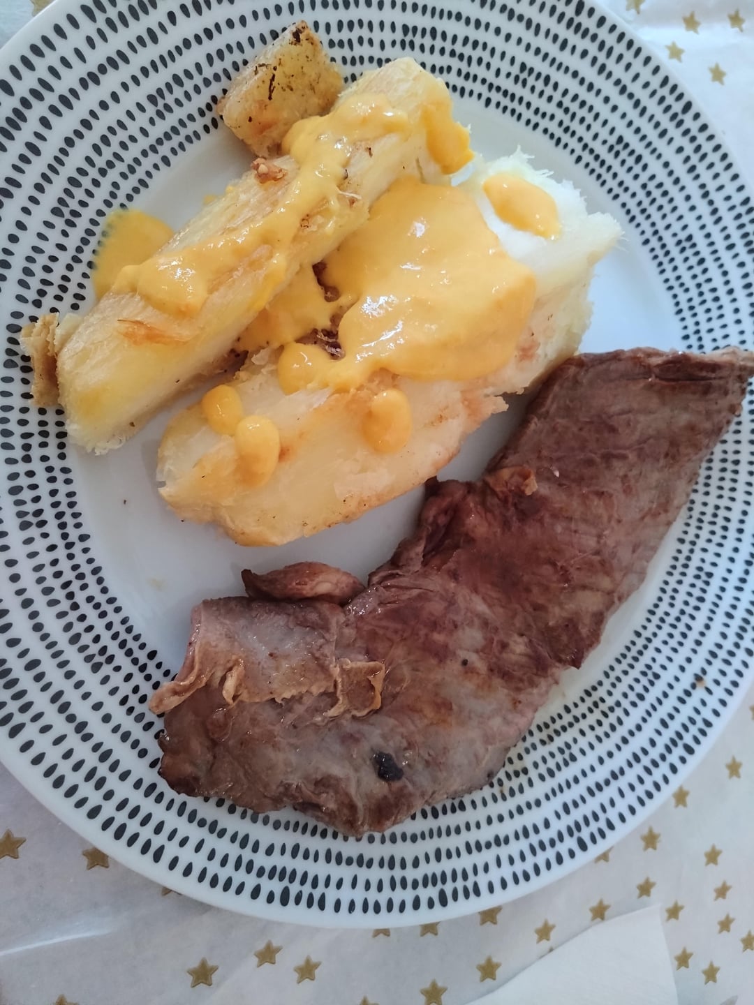 Beef Diaphragm (Entraña) is one of the most underrated meat pieces around, incredibly cheap and tasty, to cook it just throw it into the pan and fry it for 1-2 minutes on each side. Yuca/Cassava was boiled first and then fried to give it certain crispiness, on top of it I threw some huancaína sauce, which is a peruvian recipe: [https://perudelicias.com/salsa-huancaina-i/](https://perudelicias.com/salsa-huancaina-i/)