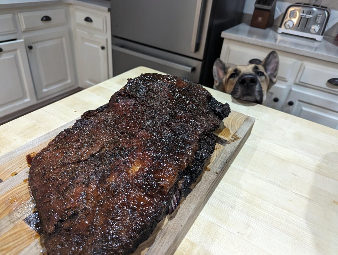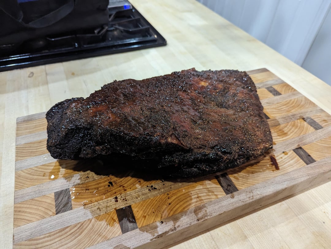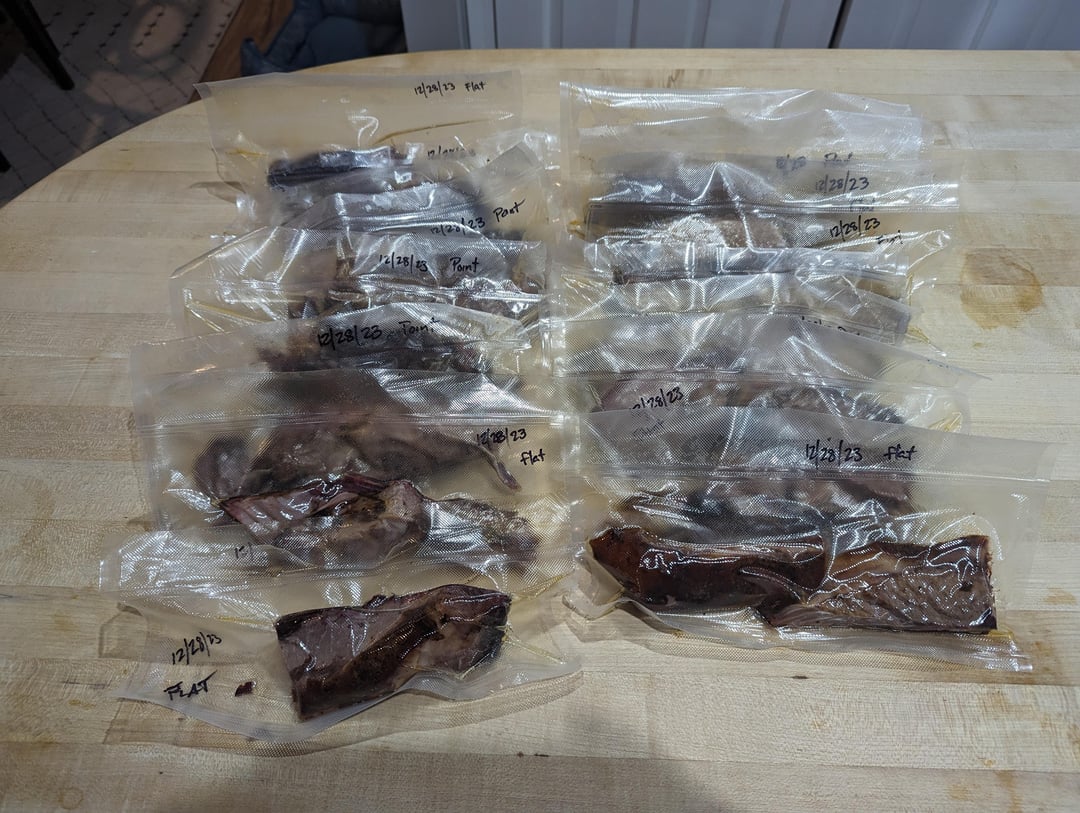 50/50 salt and pepper 180 for 8 hours overnight 225 after the stall for another 5ish hours wrapped in butcher paper rest for 2 hours cool to room temp then vacuum sealed. starting to try using the traeger for meal prepping 🤞