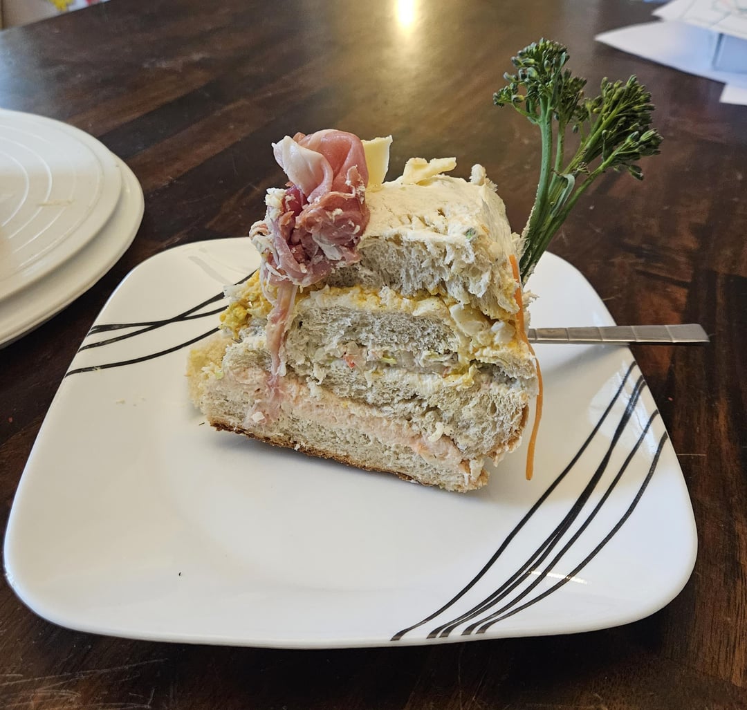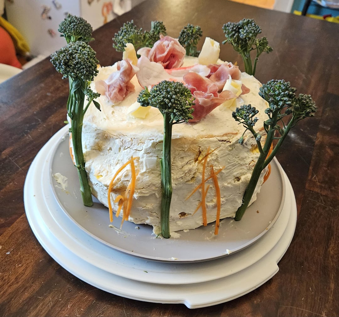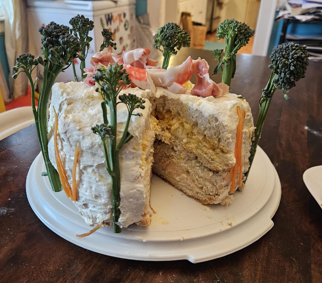 For my 40th birthday I made myself a savory sandwich cake! The layers are salmon spread, shrimp and kani salad, and egg salad. The “frosting” is a cream cheese spread. It was delicious, and a fun way to eat 3 salad sandwiches at once!!