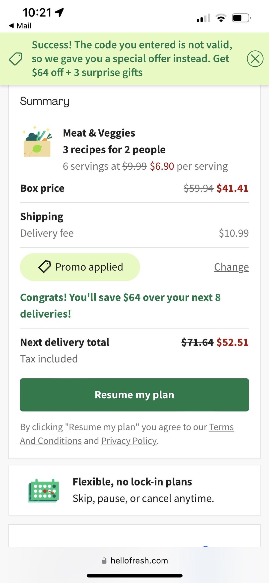 Got this email about 12 hours ago. Says on the first box you get 65% off the first box and shipping charge is waived as well. Not the case, they just say the code isn’t valid anymore and then still give you a “discount” but not as good. I’ve had I almost didn’t even notice. But the box should’ve been about $21, not $52. This isn’t the first time this has happened either..