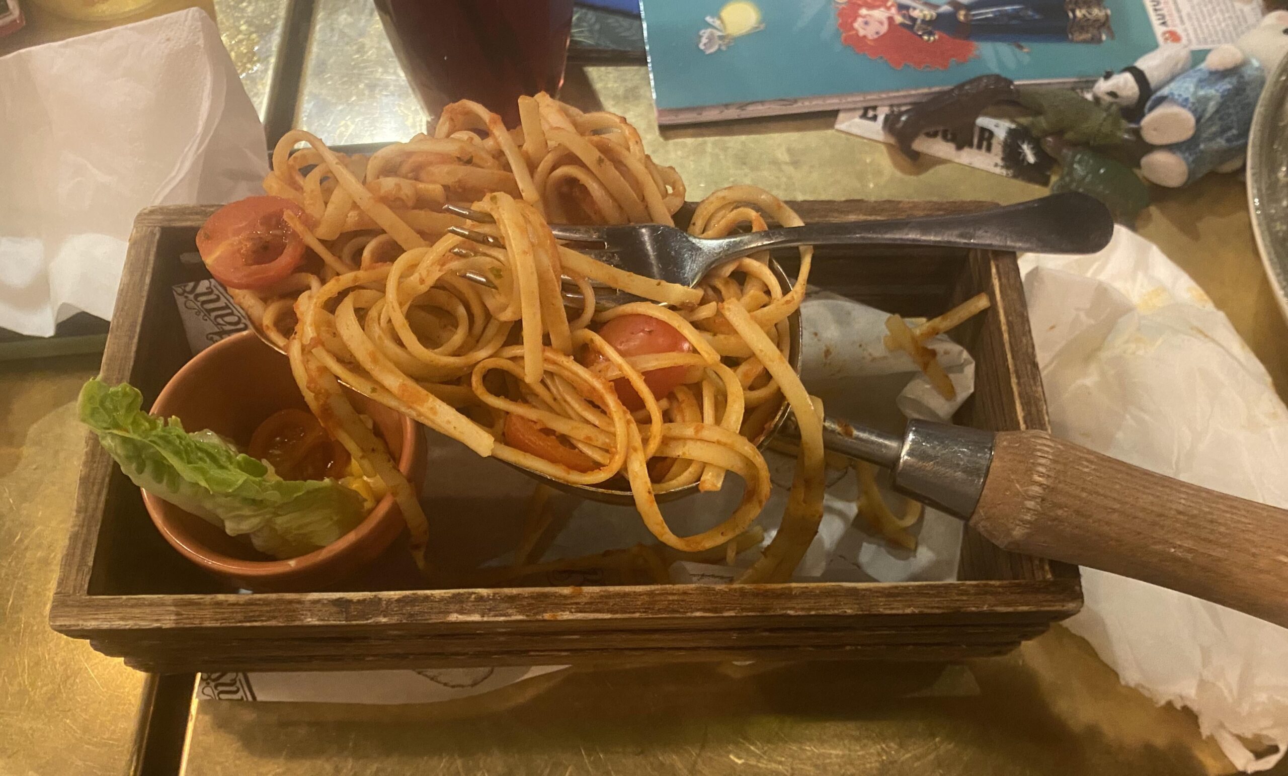 Long pasta, in a precariously perched scoop, served to a child. I guess it could be worse. Could be soup.