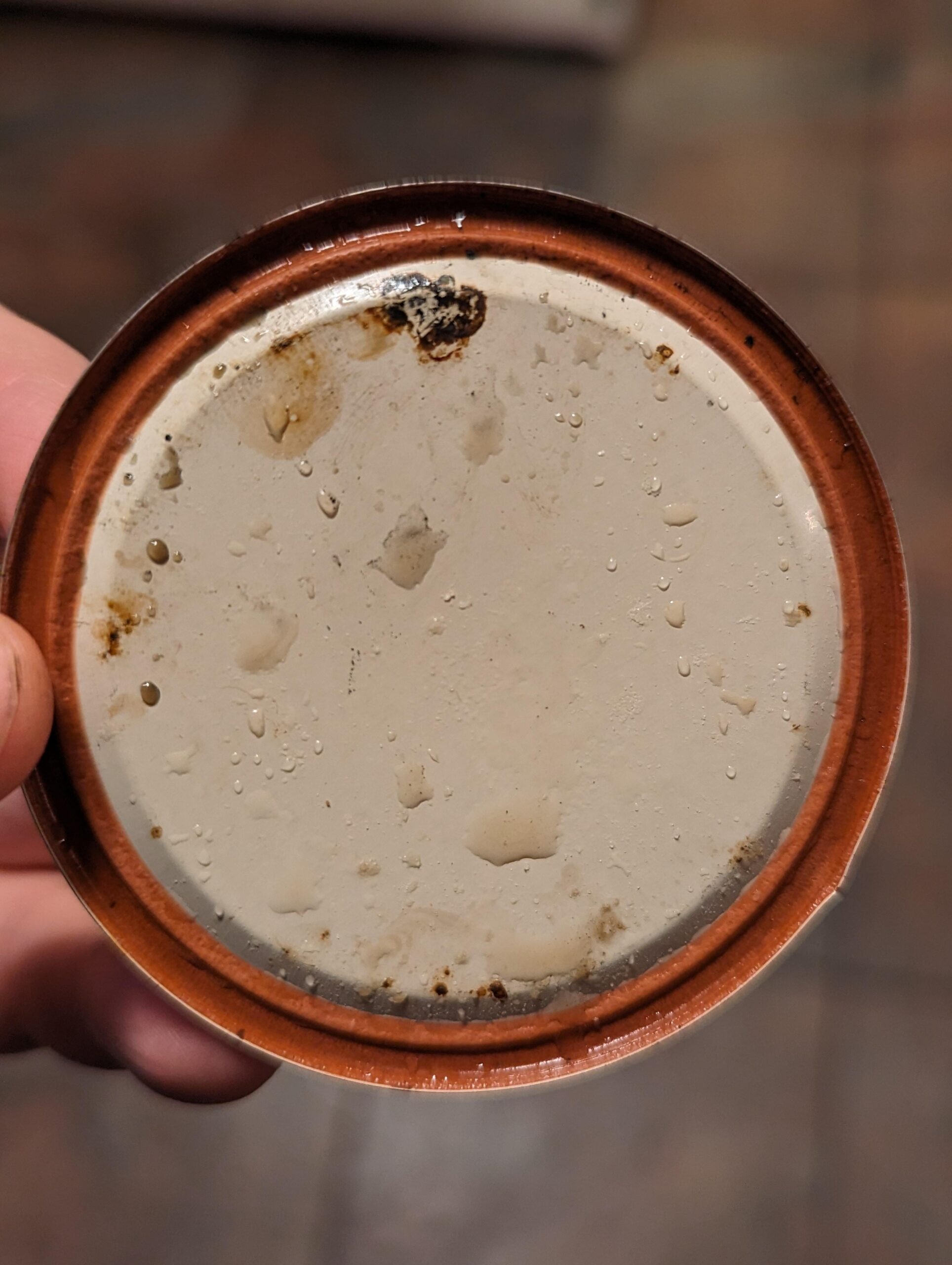 I canned beef broth last year (made my own broth and then pressure canned in pint Ball jar with Ball lids following Ball instructions, stored with rings off). Today I opened a jar and it had this blackish spot on the underside of the lid. It really seems like something burnt and not mold. It looks like this because I scratched at it some to determine that, so it’s scratched away and some of the charcoal got in the droplets of broth in the lid. Lid was still fully sealed when I opened it, popped fine, smelled fine.