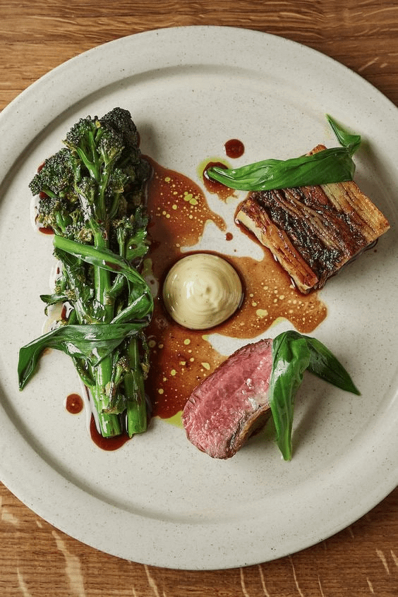What is the star of this dish? It’s kind of all over the place and the proportions are telling me what sounds like the wrong answer. Don’t care for the greenery draped over the protein either, and the sauce? Is it jus? Is it broken?
