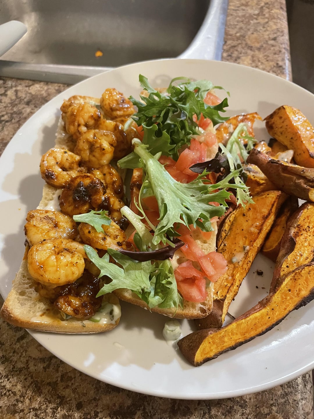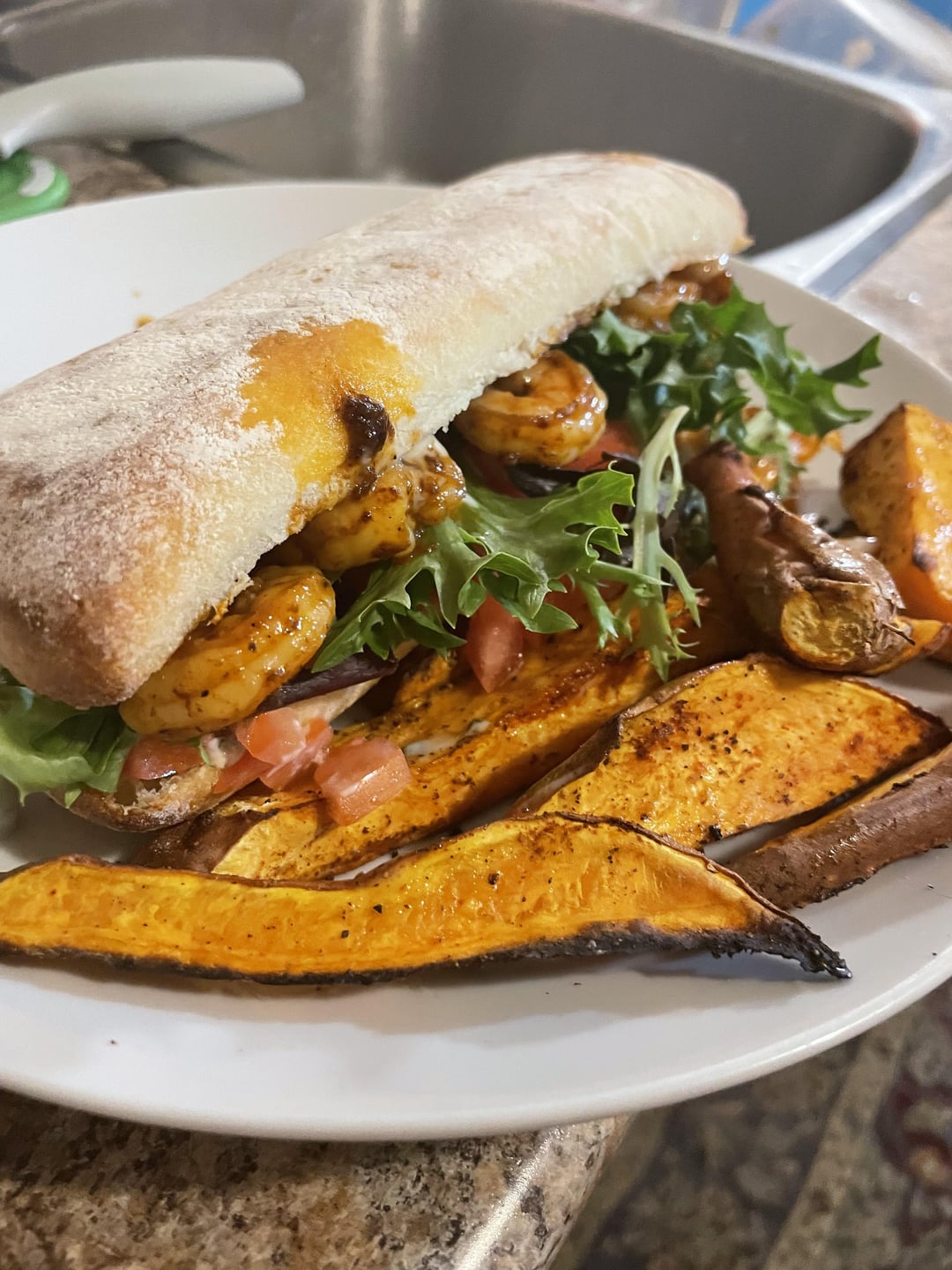 Buffalo tossed shrimp sandwich. These sammies were serving looks! On god the best meal I may have ever made nor ever had! We are literally buying all the ingredients to make this again, this Sunday! ALSO ADDED THE PRUE GAS BY ADDING RED WINE VINAIGRETTE TO THE BREAD! You have to spice it up!!