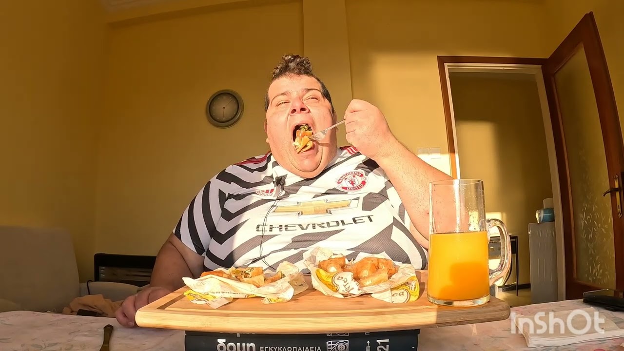 Ο άνθρωπος έφαγε 3 πογατσες με 1 κανάτα χυμό για 1 πρωινό.Εστω ότι 1 πογατσα ισοδυναμεί με 1 πρωινό και 1 κανάτα χυμό με 4 5 ποτήρια τότε το πρωινό του Χρήστου ισούται με 3,5 πρωινά ενός φυσιολογικού ατόμου! Το λες και challenge ..
