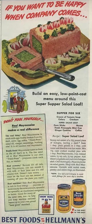 Made this hideous wartime monstrosity! I thought it was only moderately okay, but my mom and sibling loved it. Simple to make and is basically a bologna sandwich sans bread. Probably wouldn’t make again just for myself but wouldn’t turn it down either.