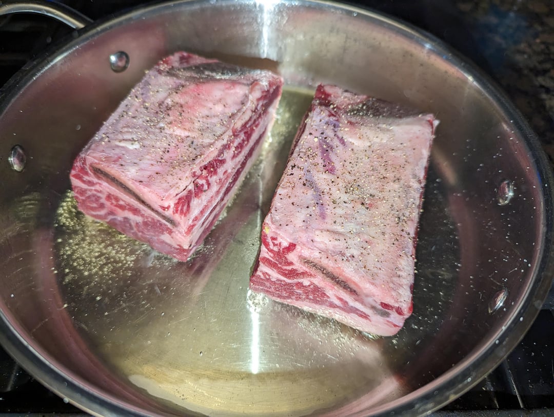 Beef short ribs braised 5 hours in 2 cups beef stock 1 cup chopped carrots 1 cup chopped celery 1 cup chopped white onion 3 smashed garlic cloves 2 cups of red wine Salt, pepper, garlic powder Extra virgin olive oil