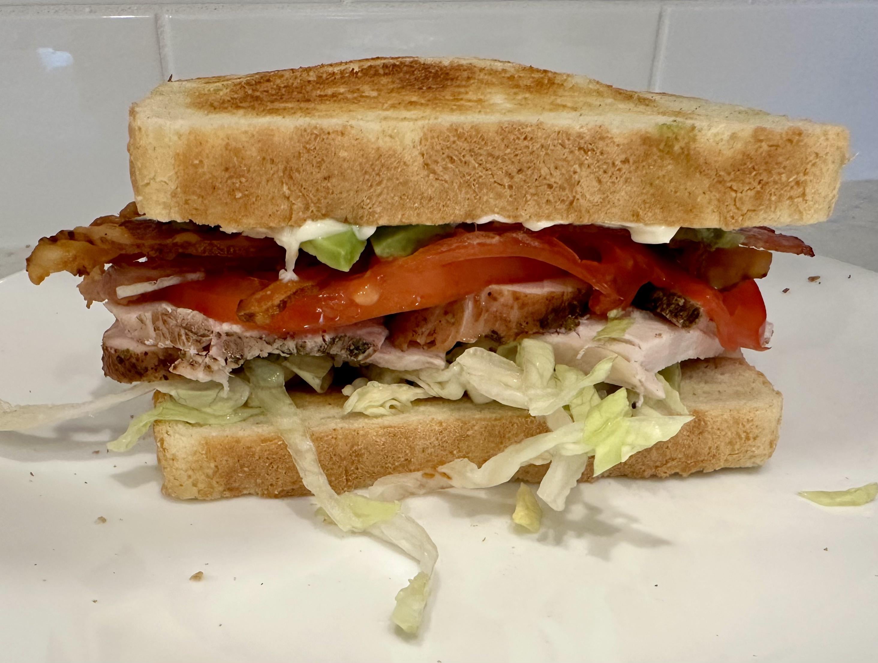 Apple Smoked Turkey Breast with shredded lettuce, heirloom tomato, avocado, bacon, horseradish, mayo