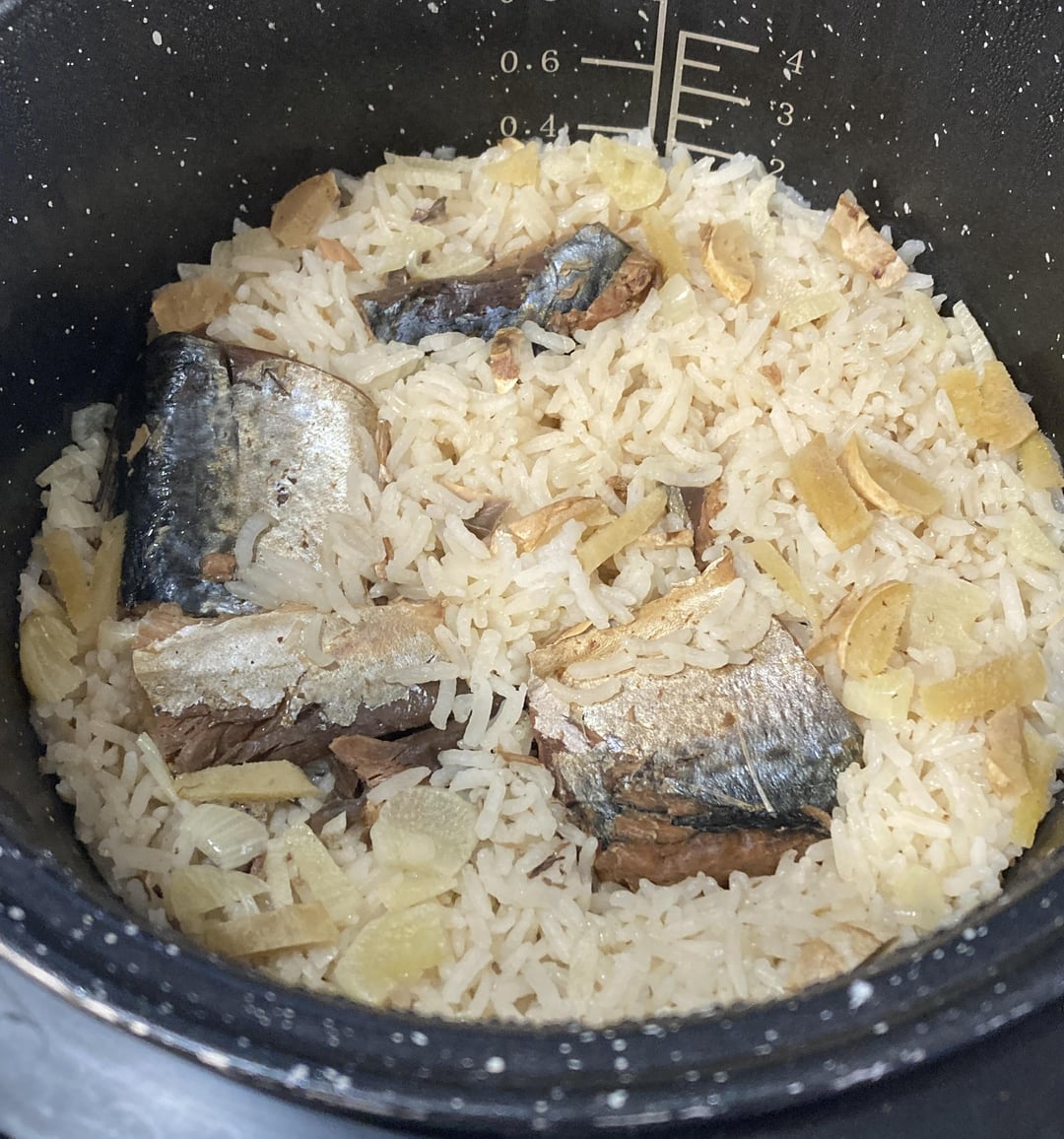 The texture of the fish was a little dry, since it had been broiled. I was going to serve this over rice anyways, so I decided to cook the rice together with some chopped garlic and ginger + tin sauce and mackerel.