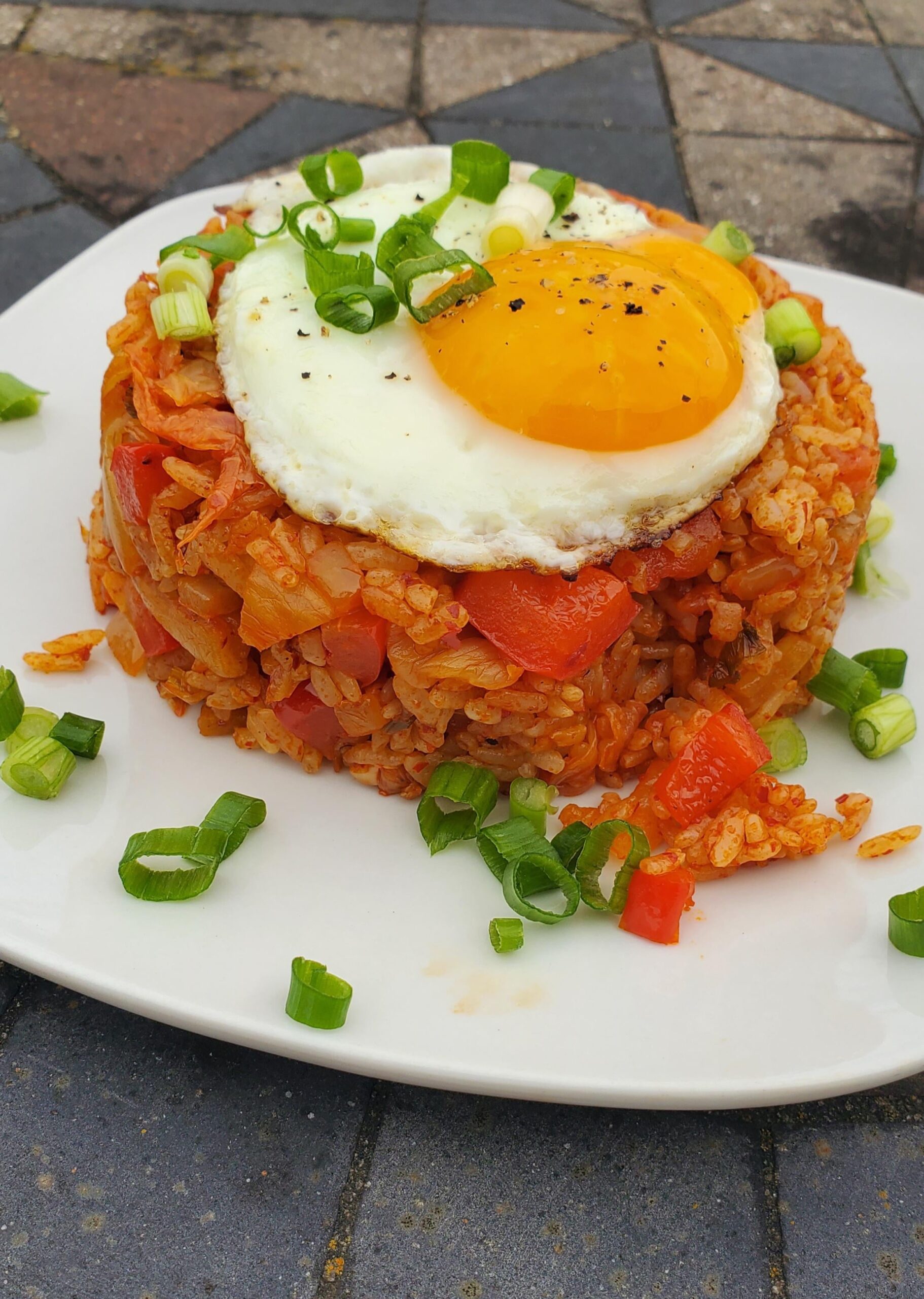 I’ve finally near the end of finishing a jar of kimchi so this was a no brainer. Kimchi fried rice topped with fried egg.