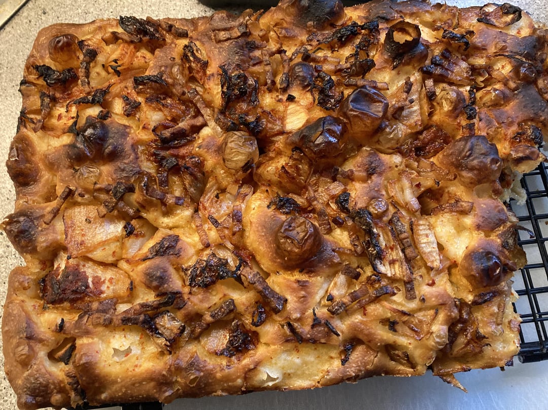 I used a serious eats focaccia recipe and topped it with my homemade mature kimchi as well as some leftover bacon that I chopped up. The braised kimchi flavor is there but not overwhelming and the bread has a nice spice level (my kimchi did turn out quite spicy this year though).