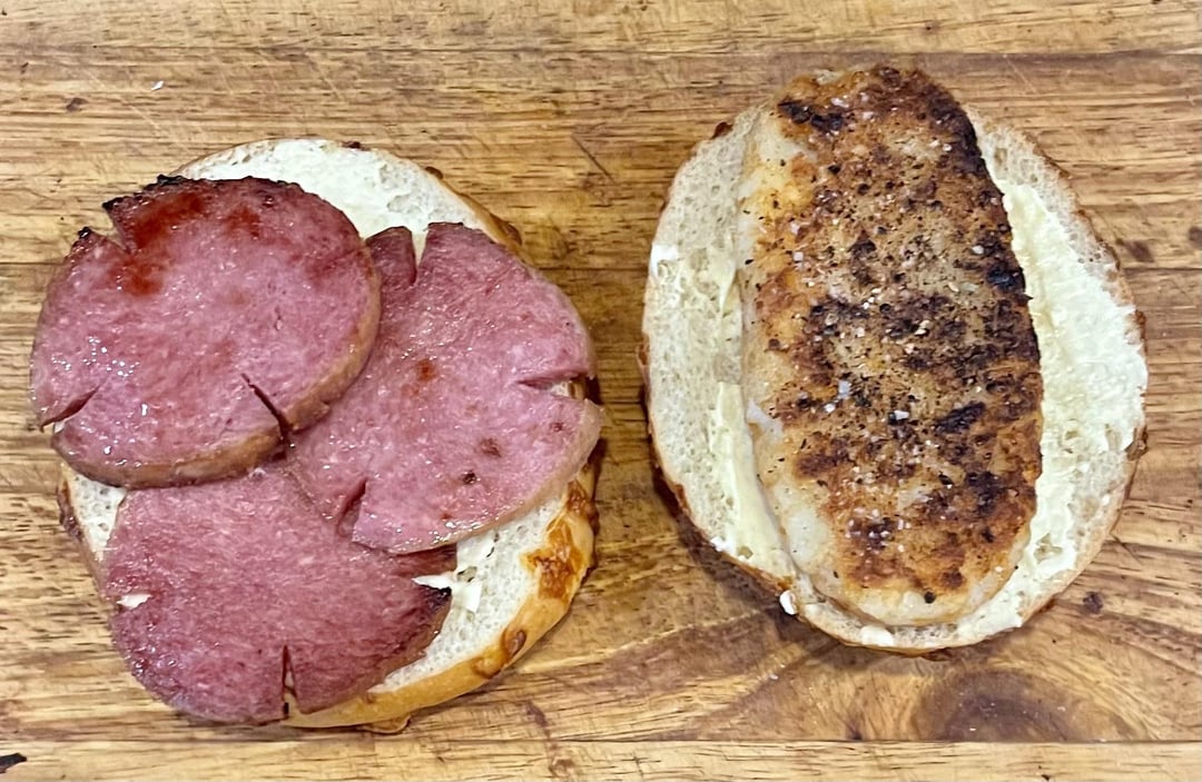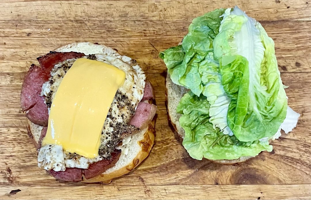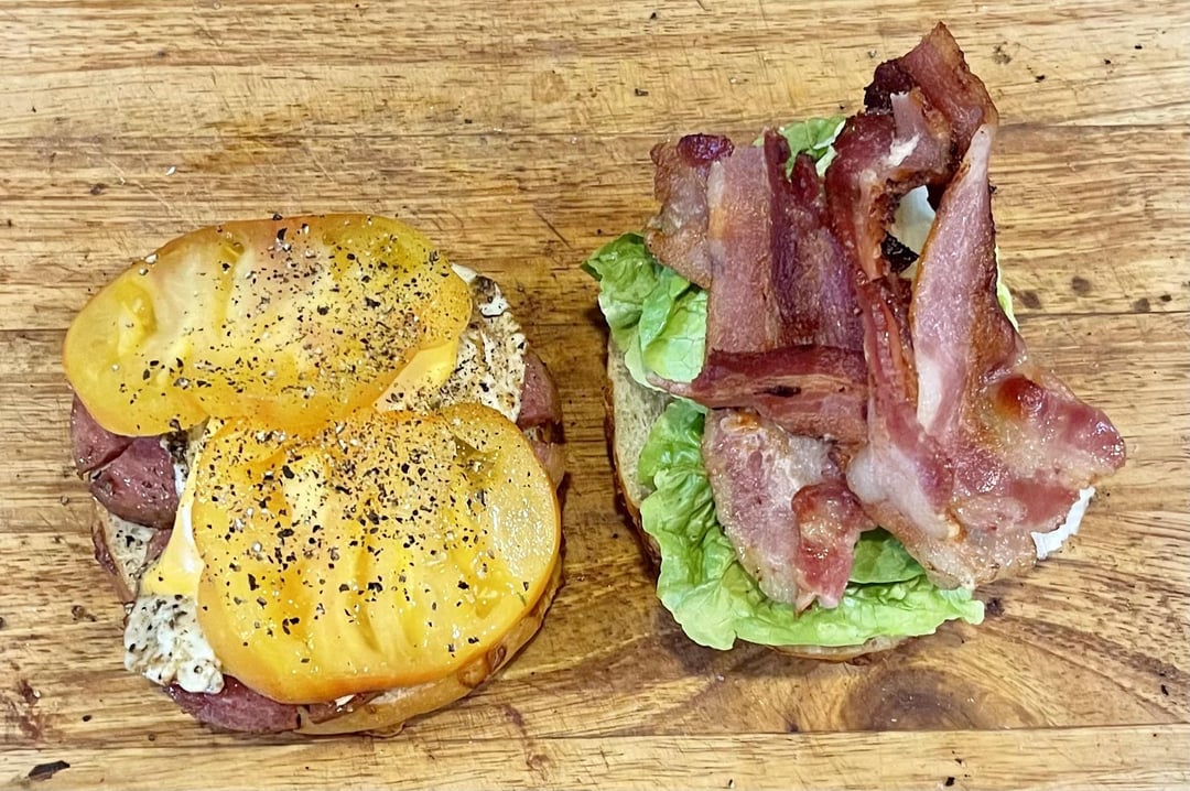 taylor ham and a hash brown, fried egg w/ american cheese and little gem lettuce, heirloom tomato and applewood smoked bacon.