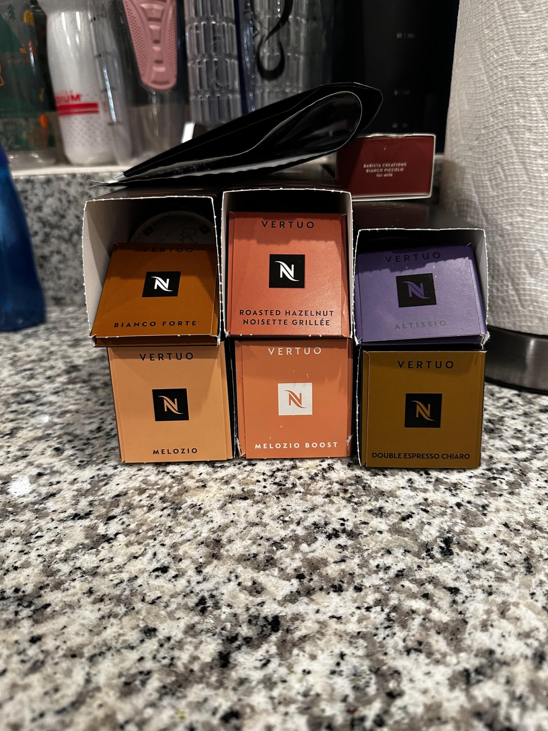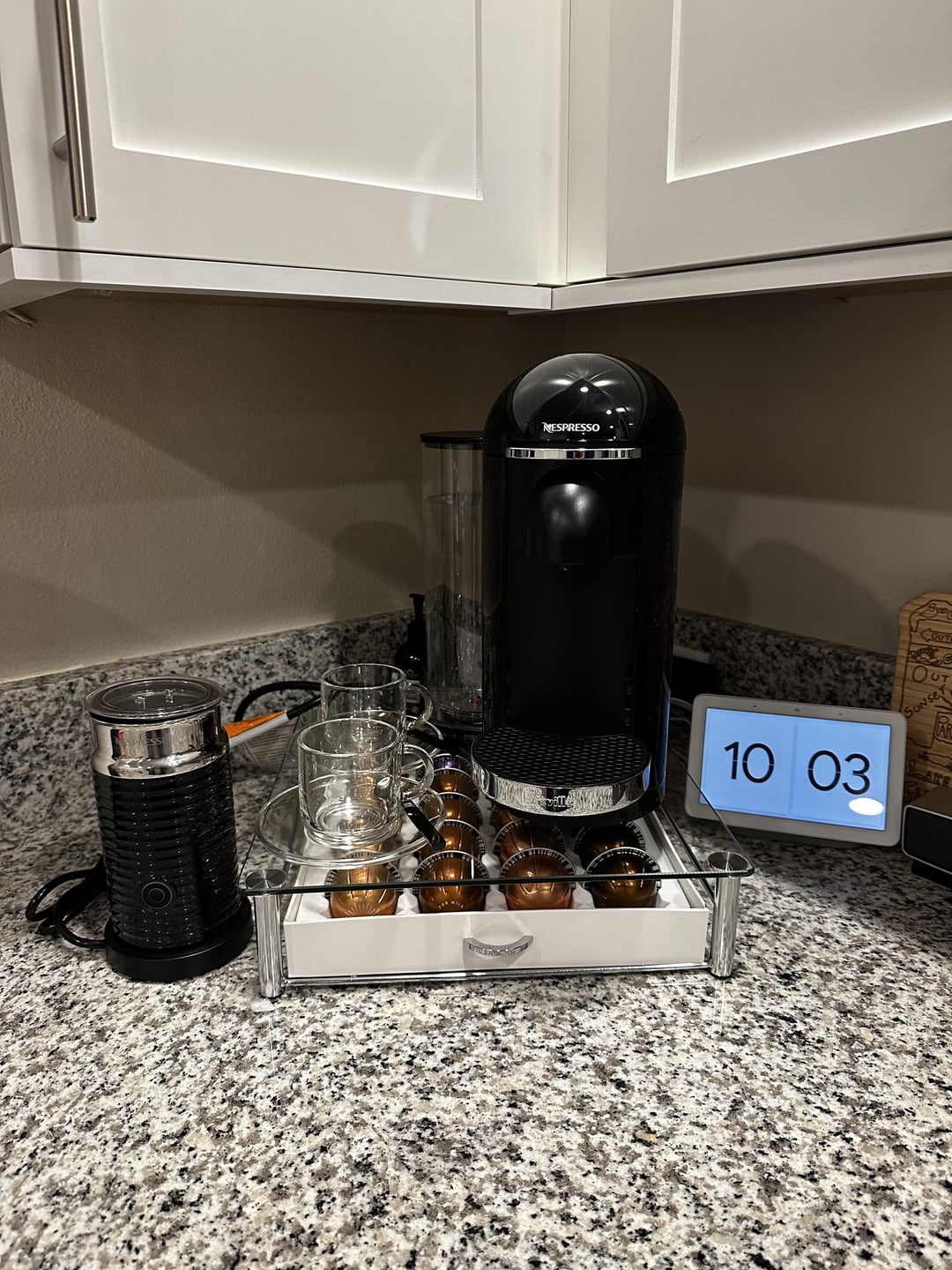 My husband got me a Nespresso VertuoPlus Deluxe with the Aeroccino 3 frother for Christmas! Been making out way through the sample pack and today we went to the local Nespresso boutique and bought 6 sleeves of the coffees/espressos that we liked. I got this drawer off of Amazon and the cup set from Nespresso 😍