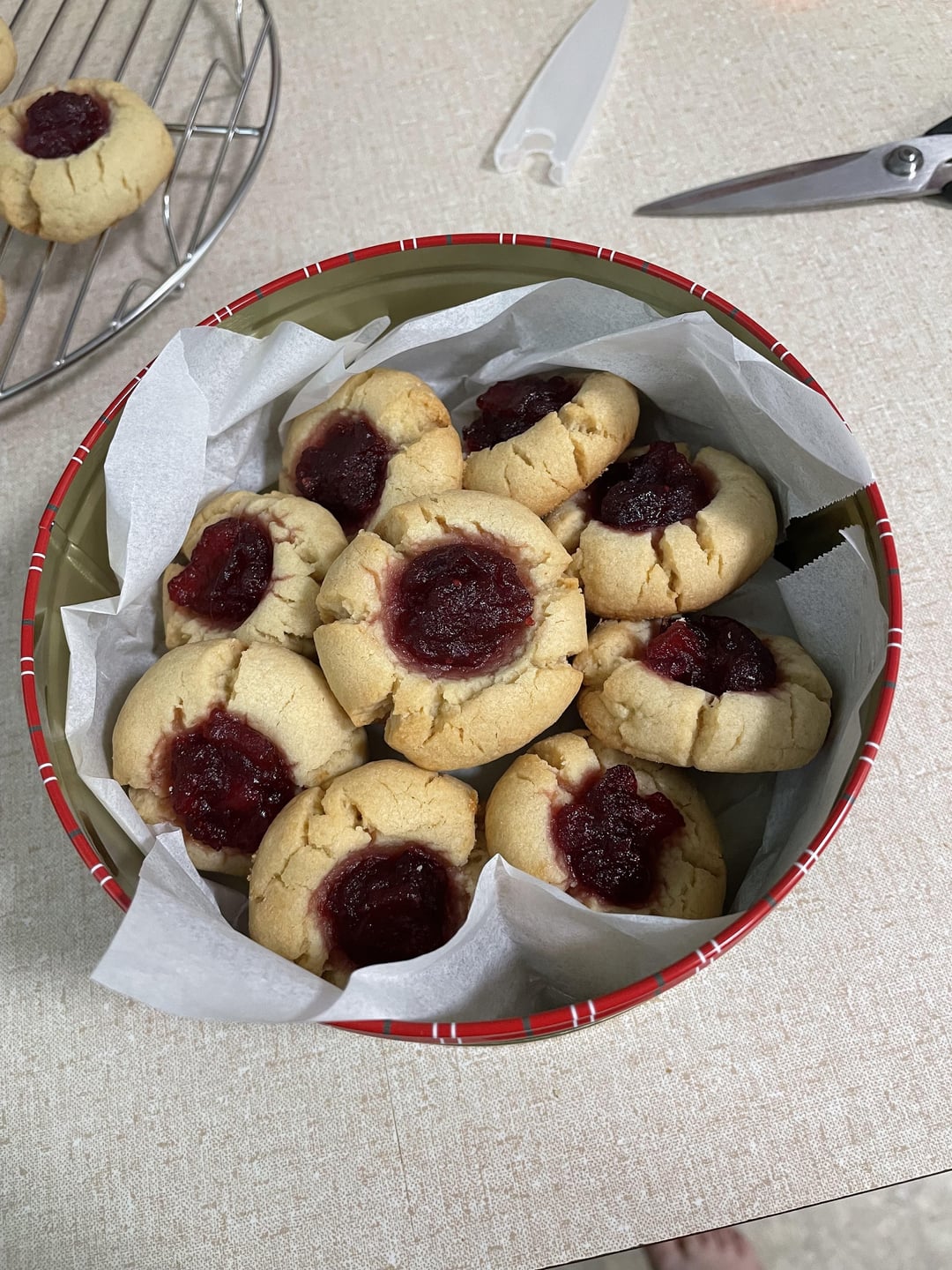 First picture is of ten thumbprint cookies with jam on a cooling rack. Second picture is of the cookies arranged in a cookie tin with parchment paper.