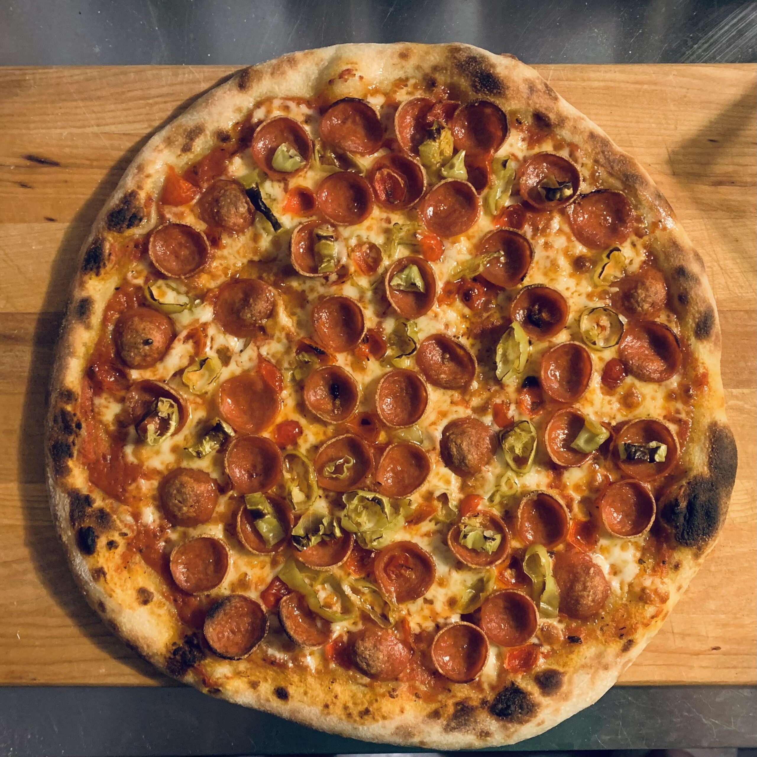 70% hydration dough fermented at room temperature during 24h, slightly cooked sauce, provolone, pepperoni, pepperoncini and some lacto-fermented biquinho peppers that were roasted with garlic. Cooked on a pizza stone in a 550f convection oven. I might go with a lower hydration next time for this style of pizza, but it is delicious nonetheless!