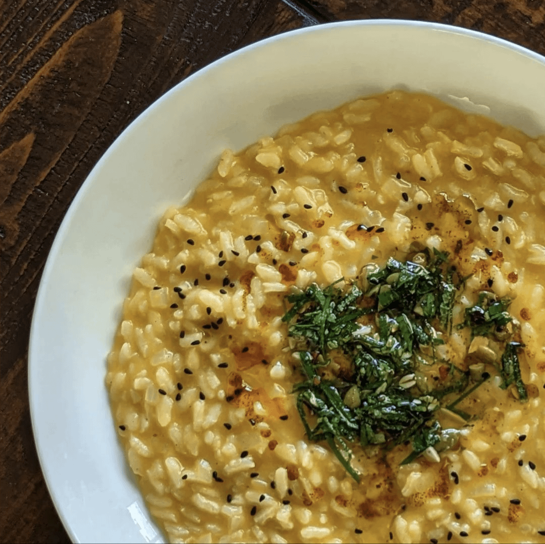 The squash was cooked in an herb “tea” to introduce additional background flavors without messing up the vibrant orange color. Herb oil is pumpkin seeds, parsley, mint, lemon zest and chili oil and really helps cut through the richness.