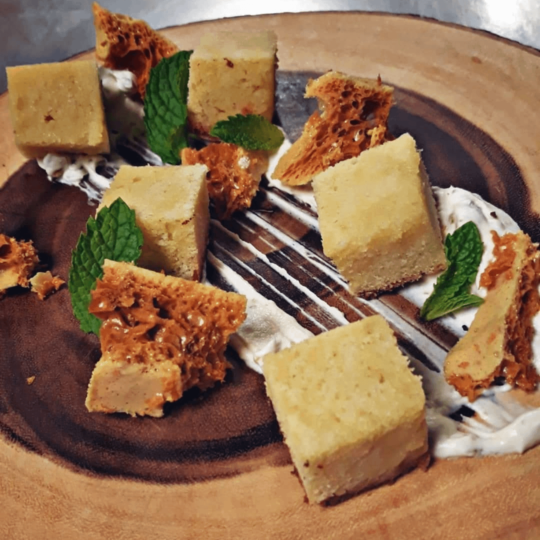 Is that… Chantilly smeared on the plate? Wait, no, the slice of tree? I hate this trend; it makes the sauce harder to eat (all of) and is lazy-chic. Not sure why you took the crust off either. I like me a crispy outer layer and you made it so no bite is the same. Cake looks either under done or drowning in syrup too, and the whole mint leaves. Do I eat them? Garnish should add to the dish. This one is a miss for me