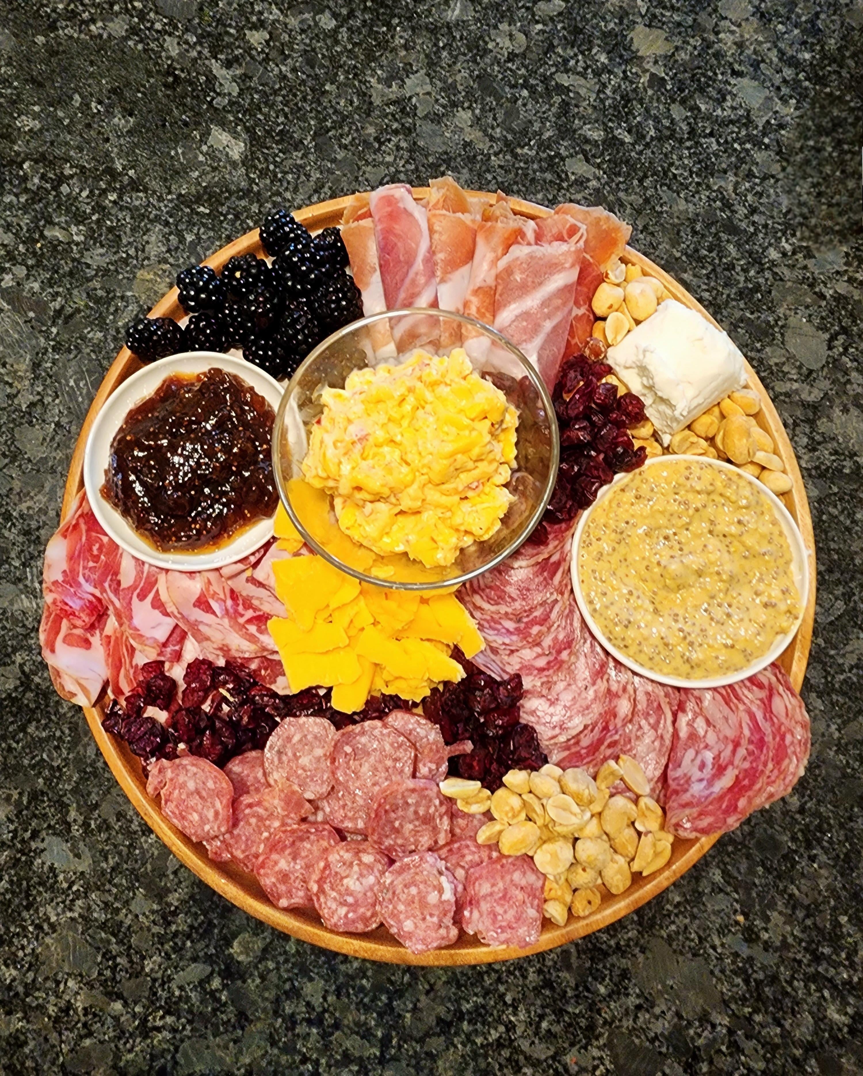 CaiomheSkeever 2 years ago This was actually from a few months ago, but I just thought to post it—my second try at a charcuterie board for a game night.Meats: * Prosciutto * Coppa ham * Salami (thin) * Salami (thicc)Cheeses: * Goat * Sharp cheddar * PimentoSpreads: * Orange fig jam * Lusty monk mustardOther: * Dried cranberries * Roasted peanuts * Blackberries