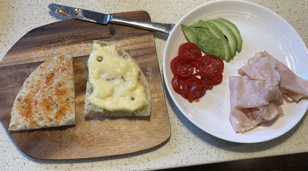 Jarlsberg cheese (warmed in oven on the bread briefly to soften the cheese a little and rejuvenate the bread)/