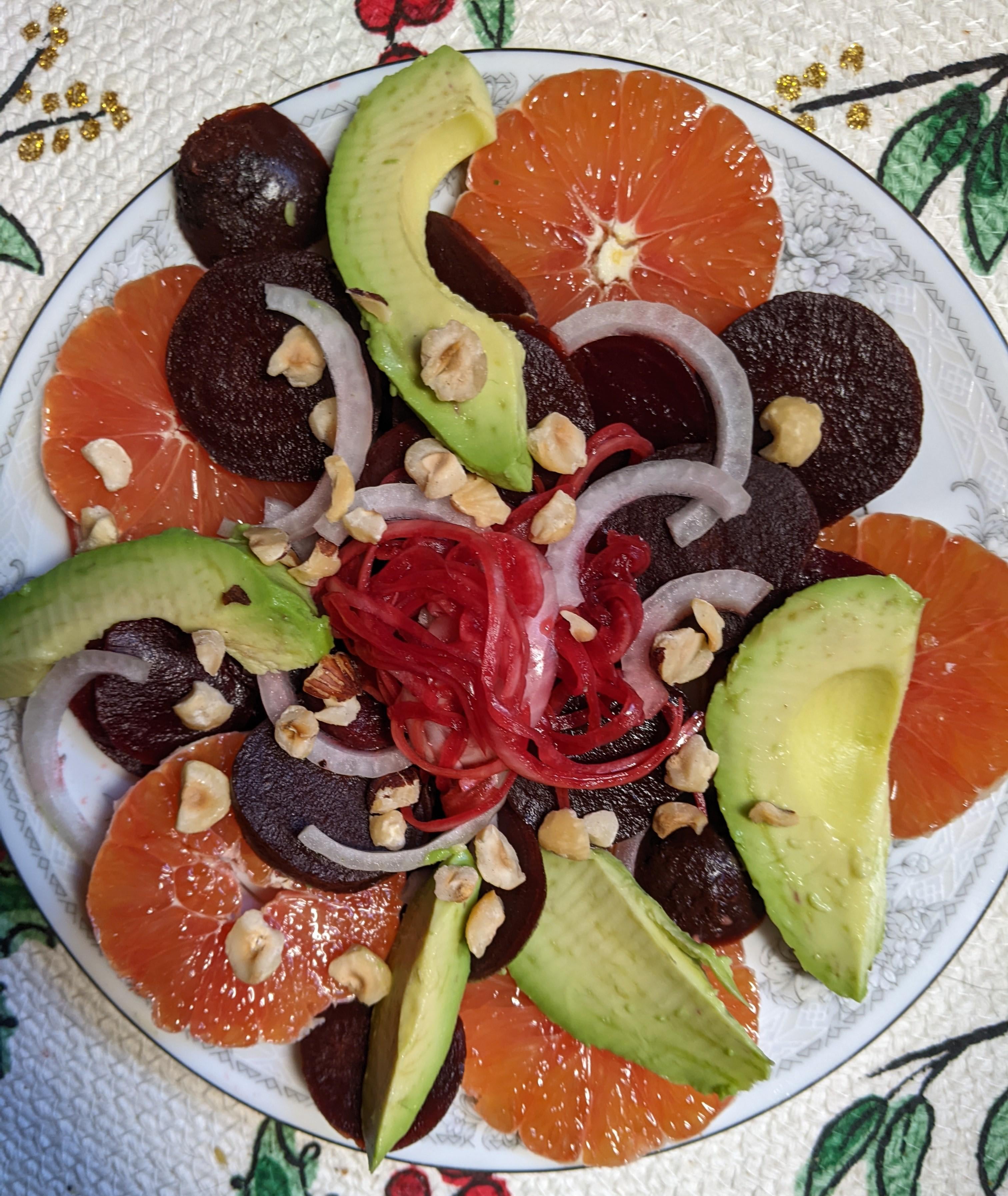 Beets, oranges, onions, avocado, and hazelnuts. After the photo I dronched it in balsamic vinegar.