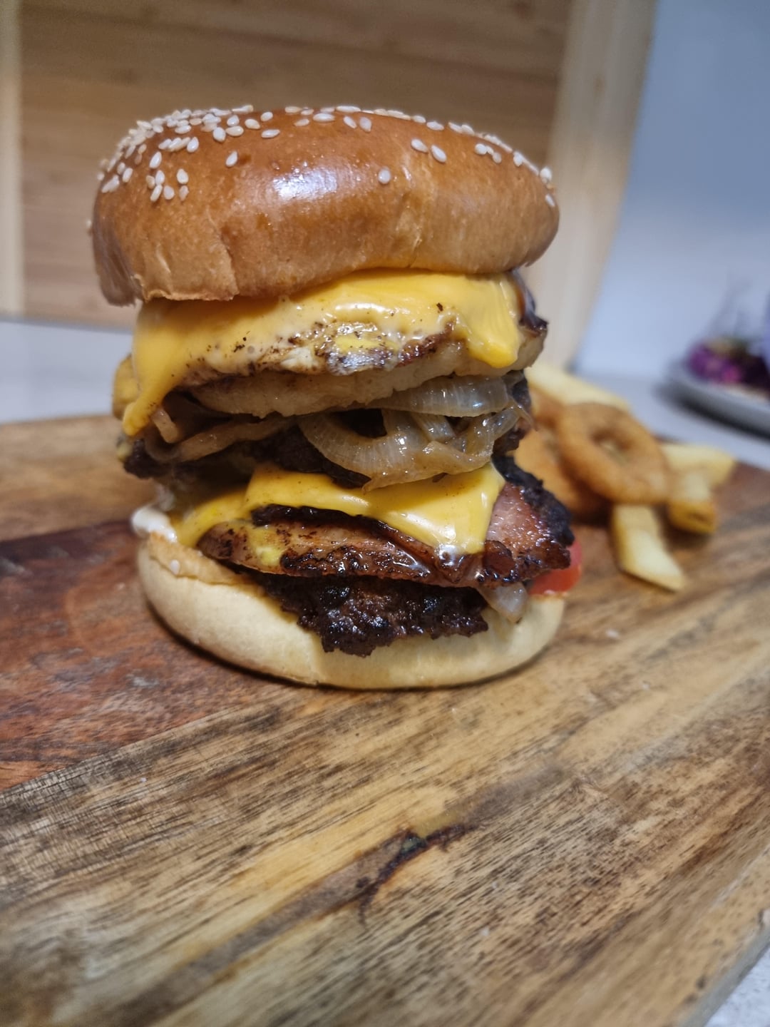 Pic 2 is 2 smashed patties, almost caramelised onion, pineapple, fried egg, aioli and ketchup.