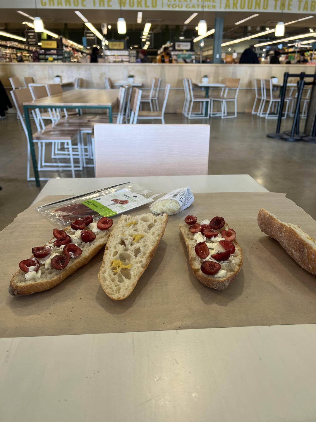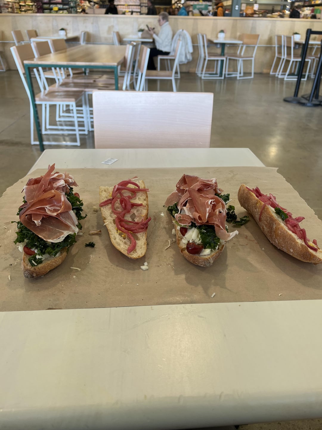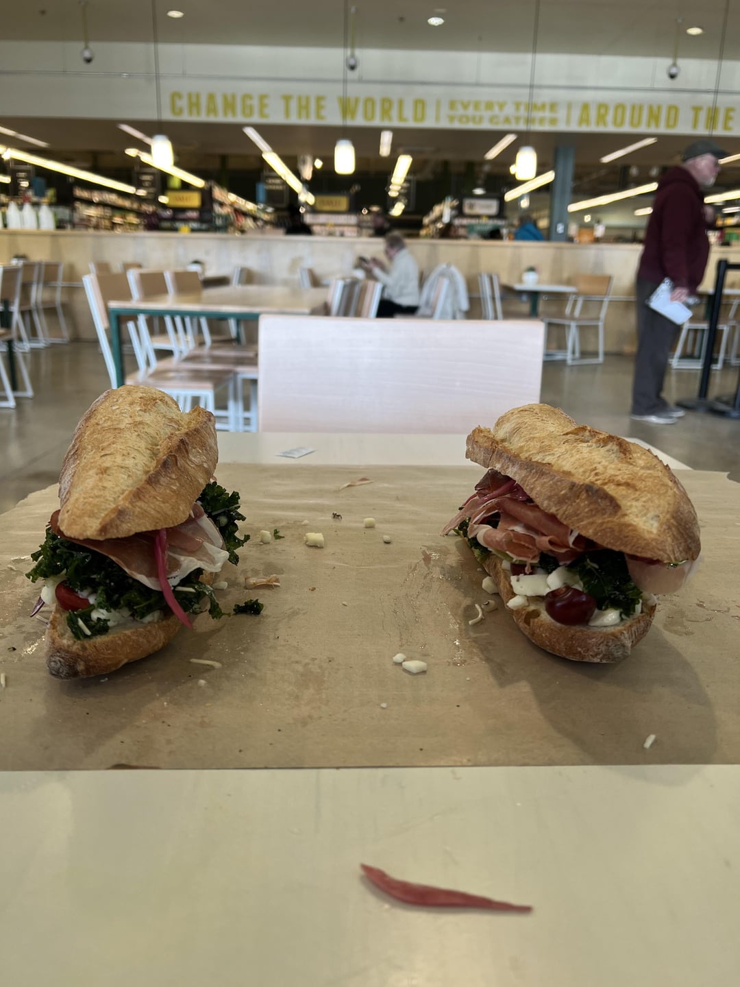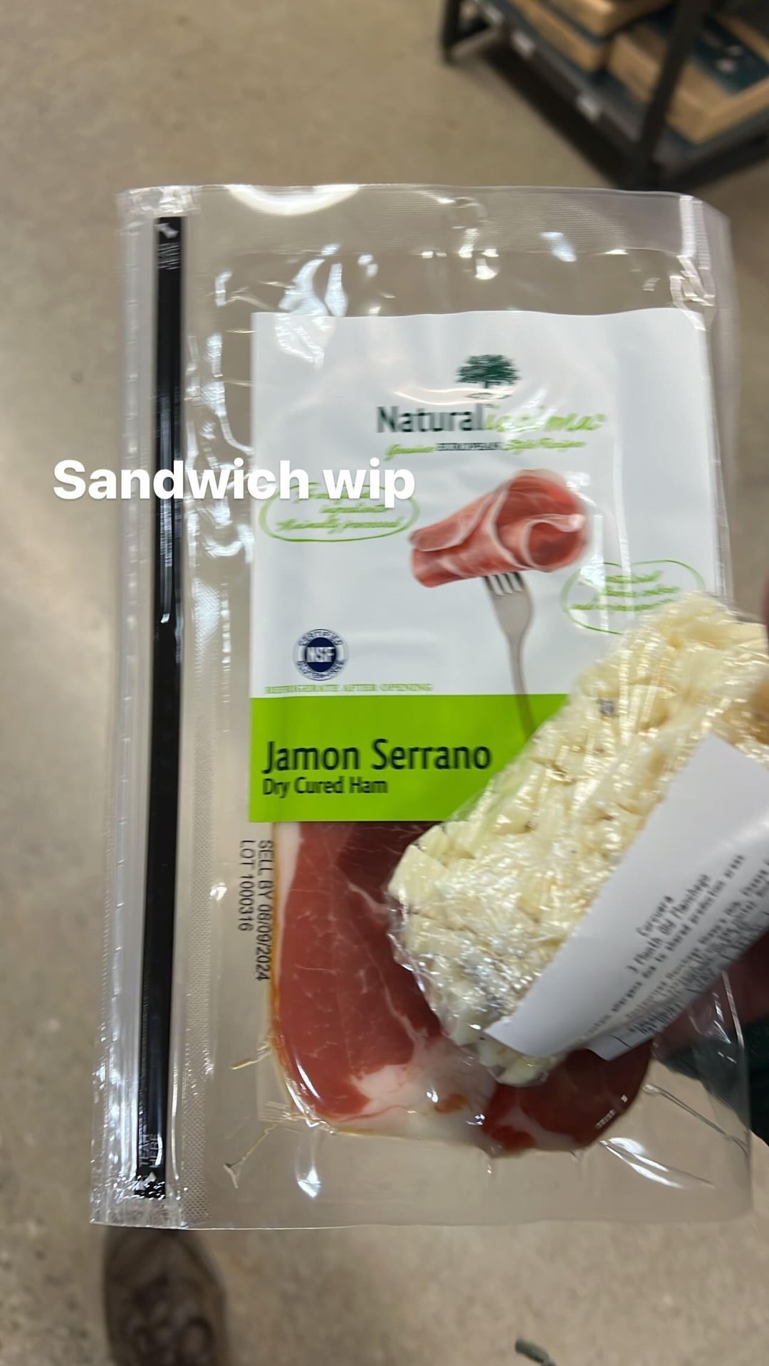 Made a sandwich for a coworker on my break with jamon Serrano, freshly cut 3 month manchego and he wanted it shredded but all I had was the cheese cutter so I freestyled, cherries, sir Kensington mayo, pepper, pickled onions, garlicky kale from prepared foods (100% the best prepared food item that’s at Whole Foods), and tiny bit of mustard on an ancienne baguette