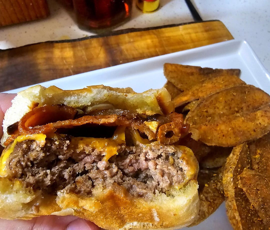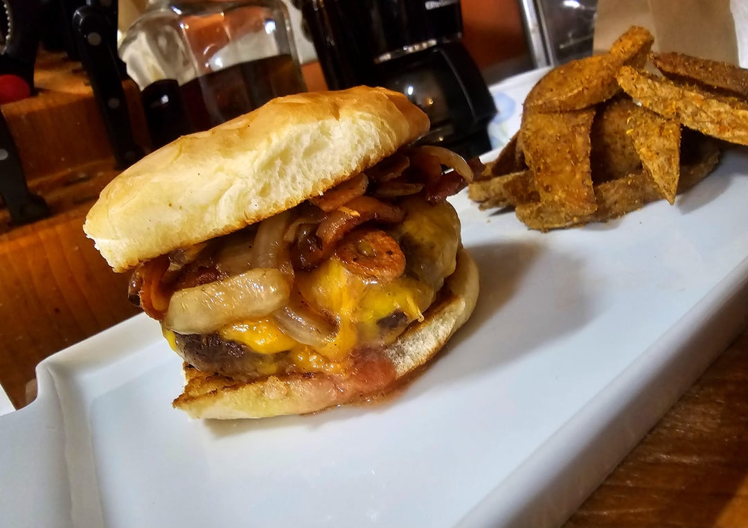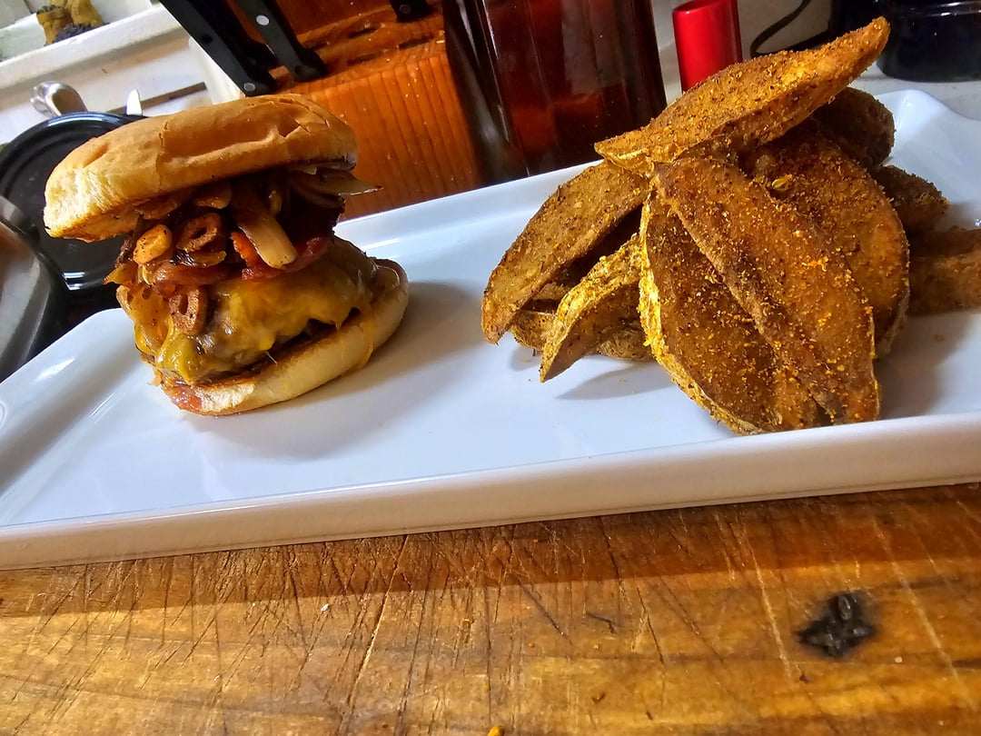 Bacon Cheeseburger w/ Grilled Onions, Fried Garlic, & Cajun Wedges by XRPcook Write A CommentYou must be logged in to post a comment.