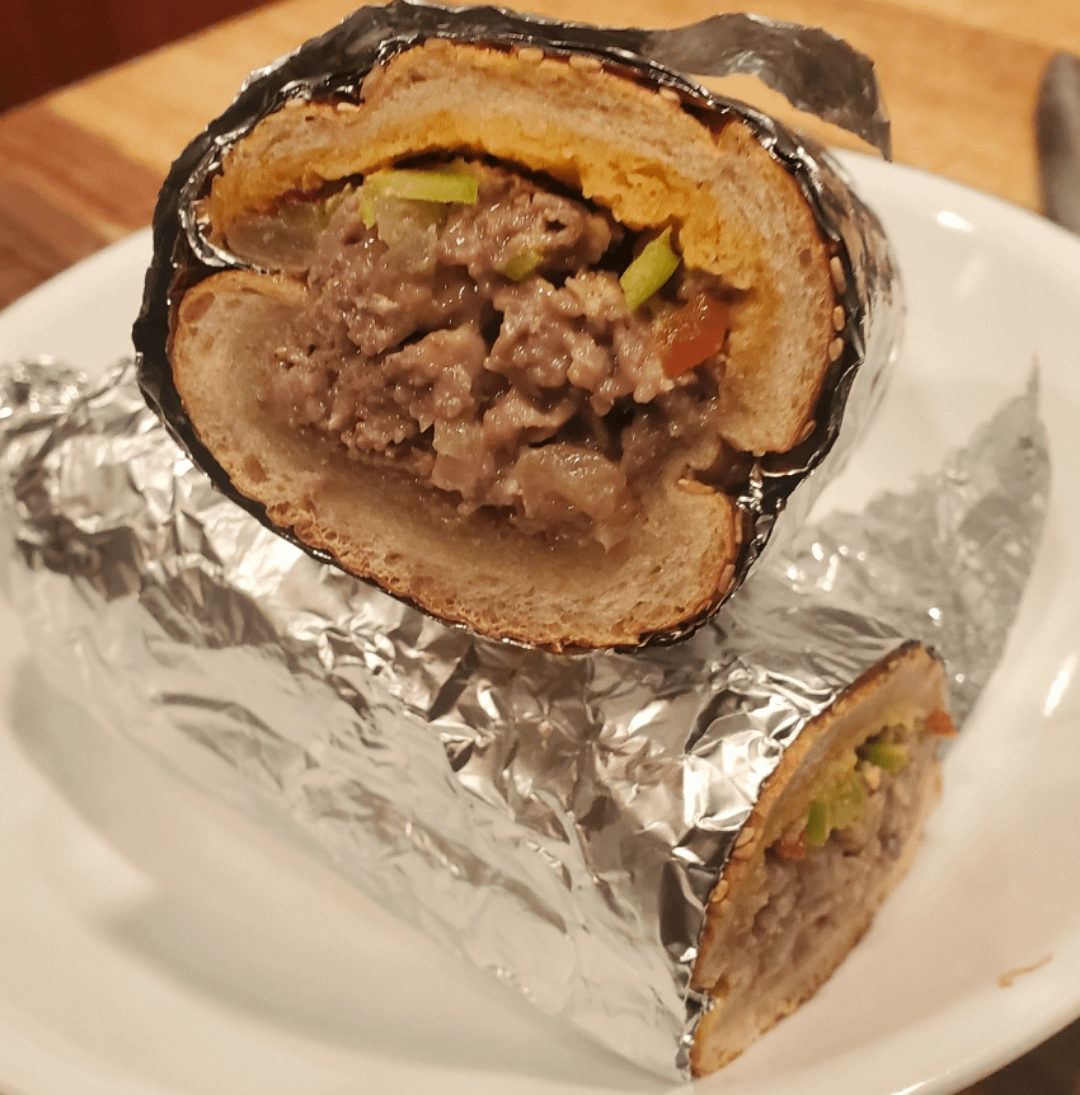 Philly Steak: Shaved Ribeye, American & Sharp Provolone, Caramelized Onion, Cherry Pepper, Calabrian Chili Oil, Seeded Semolina