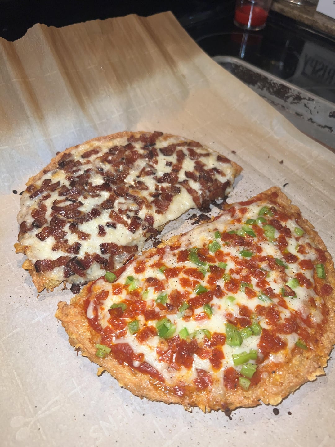 it holds it shape as a crust and the toppings i chose were sauce, mozz, pepperonis and peppers for one side and the other side is ranch mozz and bacon