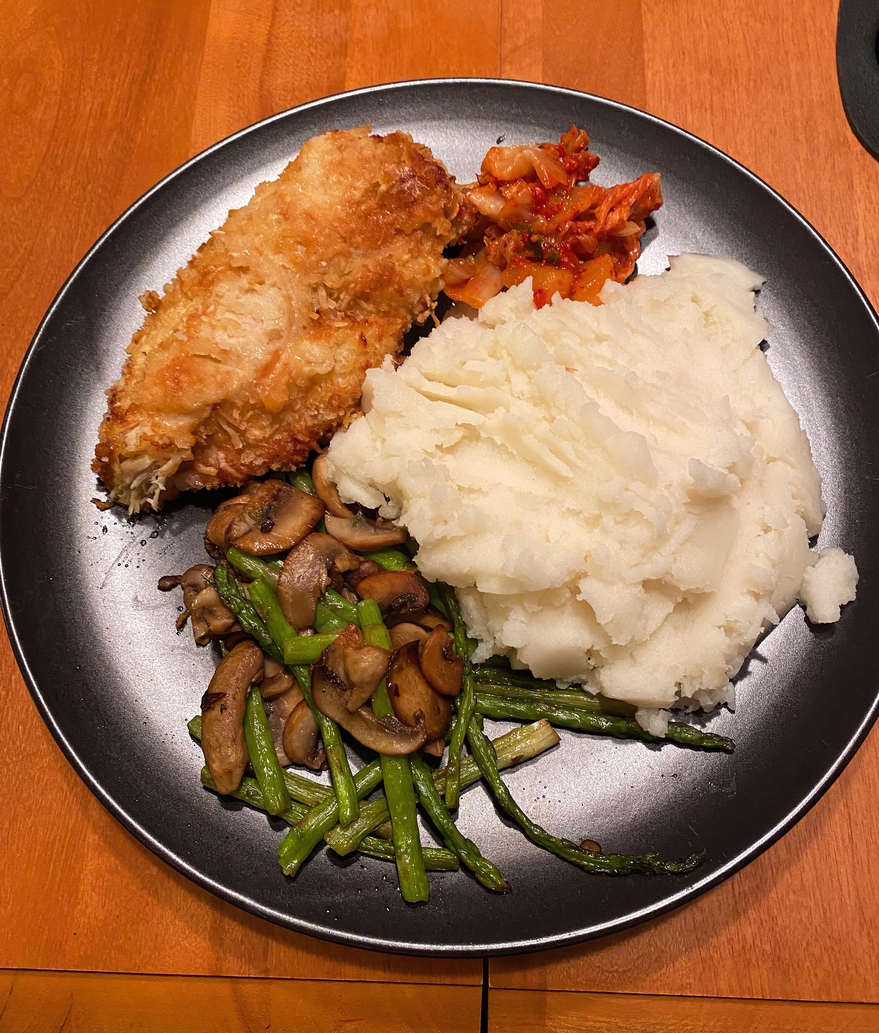 Panko breaded chicken breast, mashed potatoes, sautéed asparagus and mushrooms with a side of kimchi