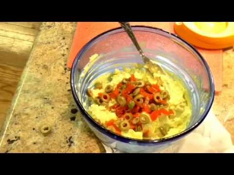 6 eggs in enough cold water to cover them. Boil 10 minutes. Empty out hot water and add cold water to the pan. After about 2 minutes, empty that water and add cold water again. Let them sit about 10 minutes in the cold water. Crack as per my directions in the video. Mash the eggs up. Add between 1/3 and 1/2 cup of mayonnaise (a little at a time) and mix.