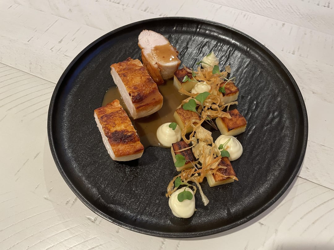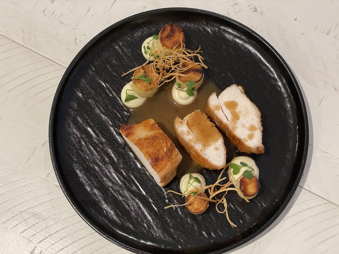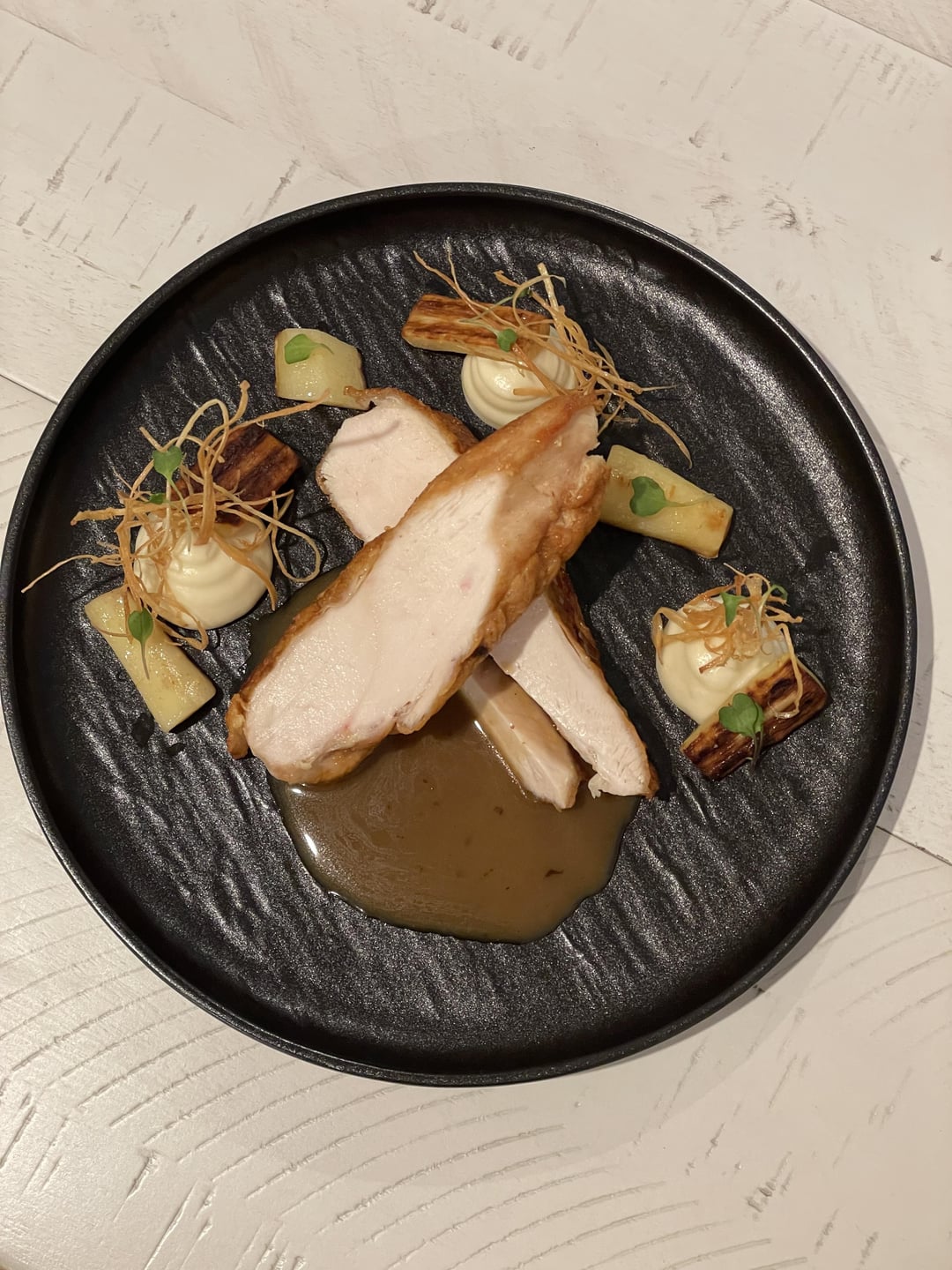Sauce from 4, chicken from 1, parsnip from 3. That skin looks incredible, so don’t put anything on top of it. Not sure I love the singular color (aside from the micros), but it does all looks properly cooked.