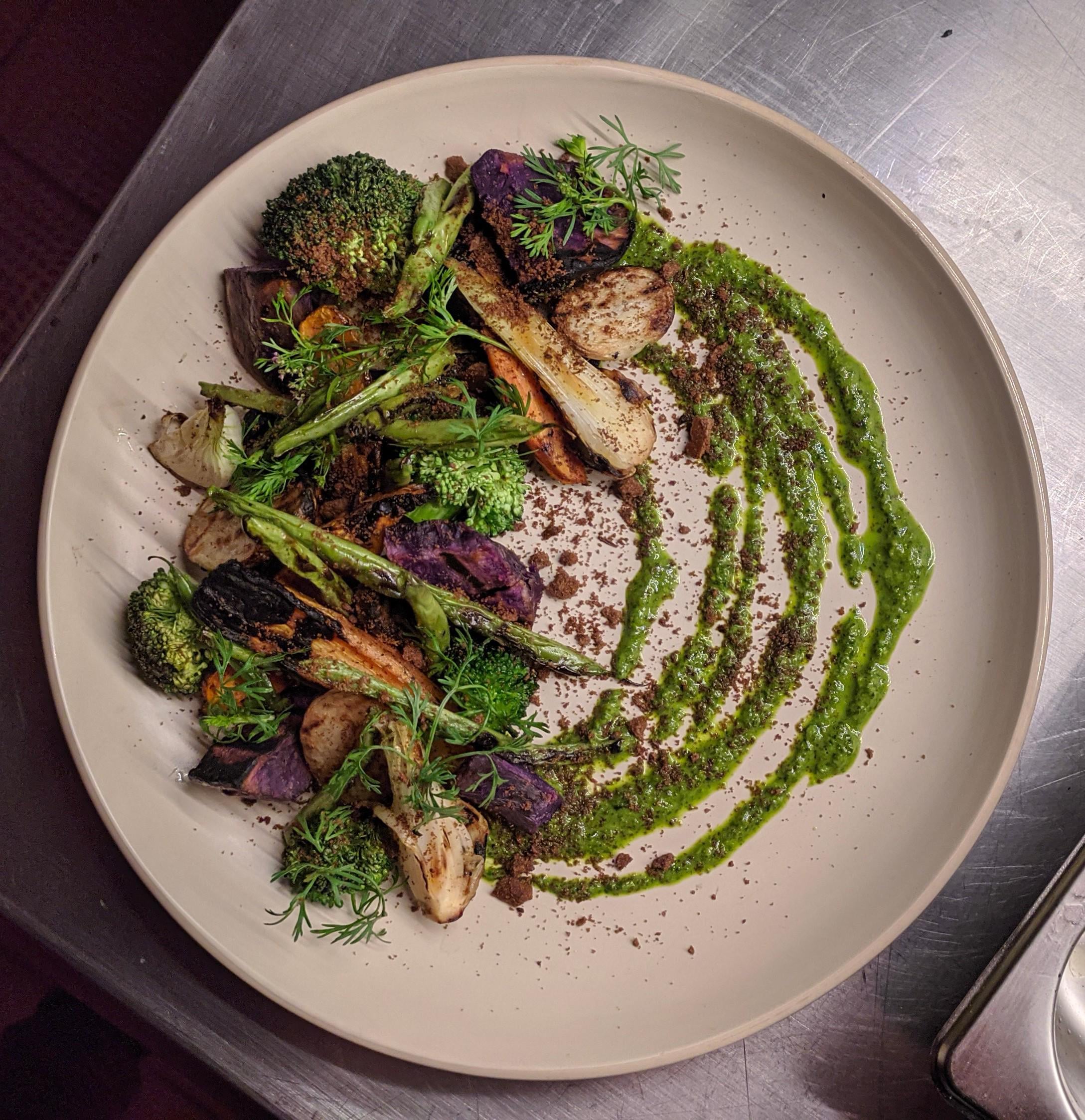 Warm grilled vegetables which include broccoli, carrots, purple sweet potato, cambray onions, with a rye dirt and an arugula and spinach purée, garnished with cilantro criollo. A ramekin of vegetable jus is usually served on the side.