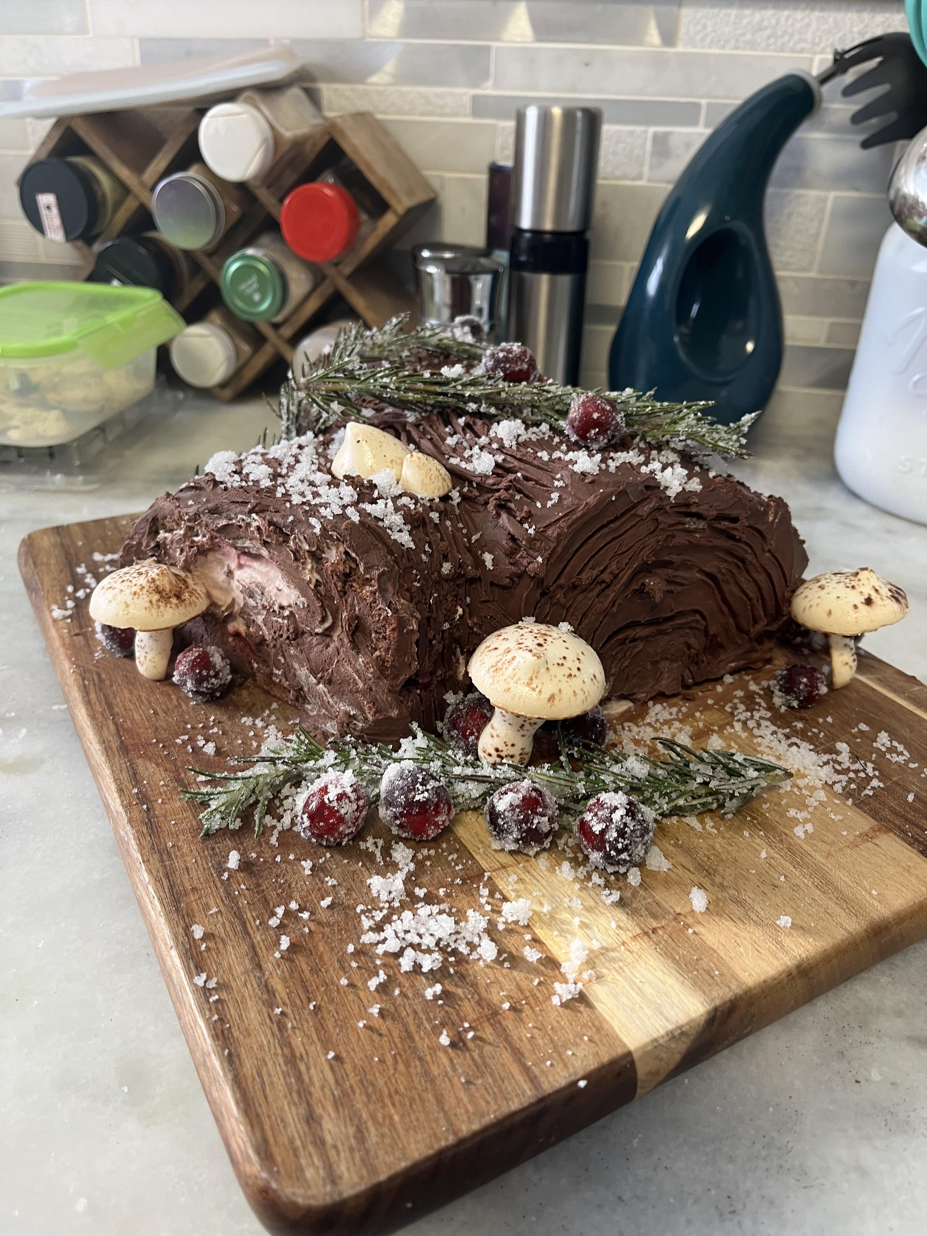 My first Yule Log! Chocolate cake with baileys cocoa whipped cream, cranberry jam, and covered in chocolate ganache. Garnished with meringue mushrooms, candied rosemary and cranberries, and sugar snow. by knsynchro Write A CommentYou must be logged in to post a comment.
