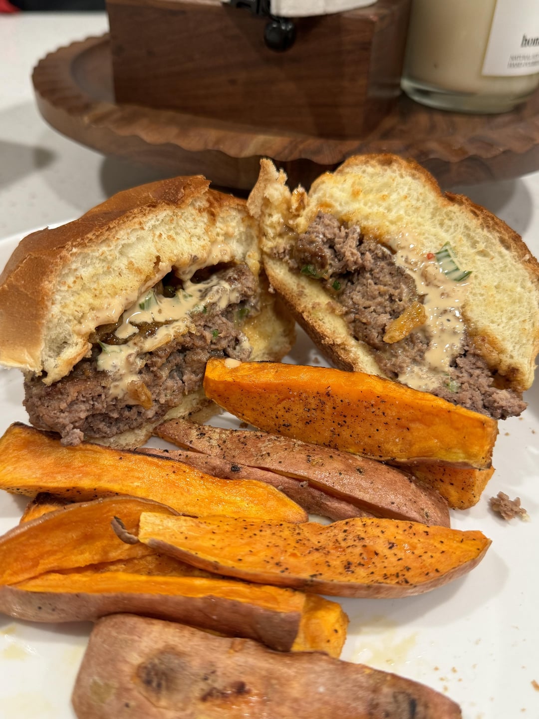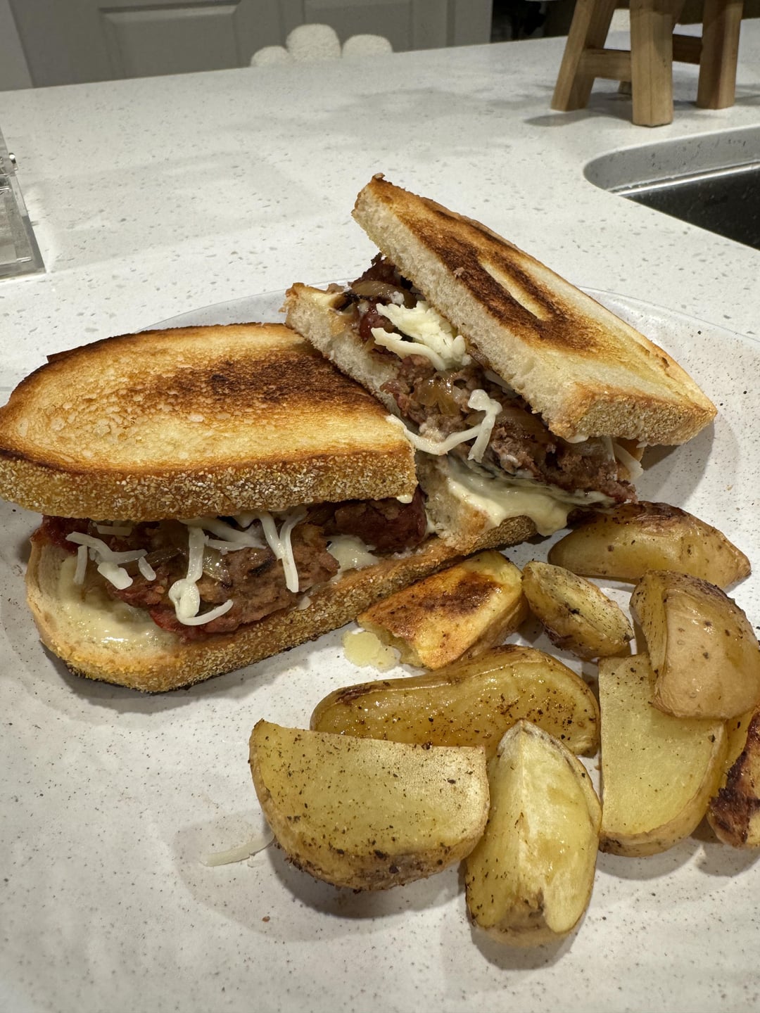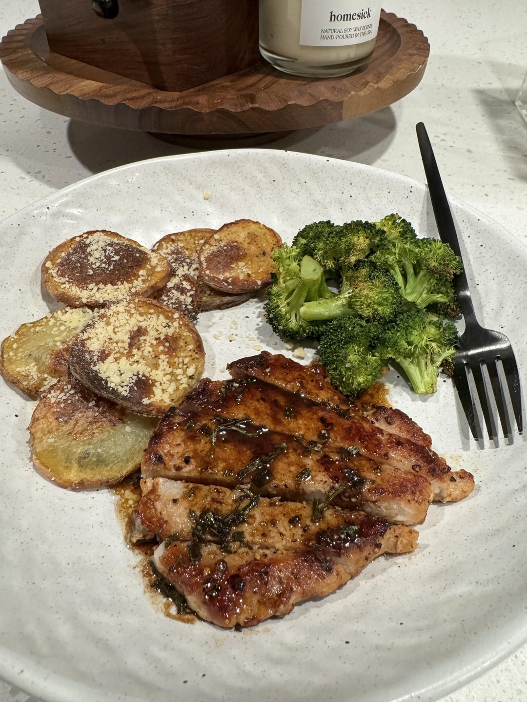 Added some potato to the pork chops for my fiance. (His plates pictured).