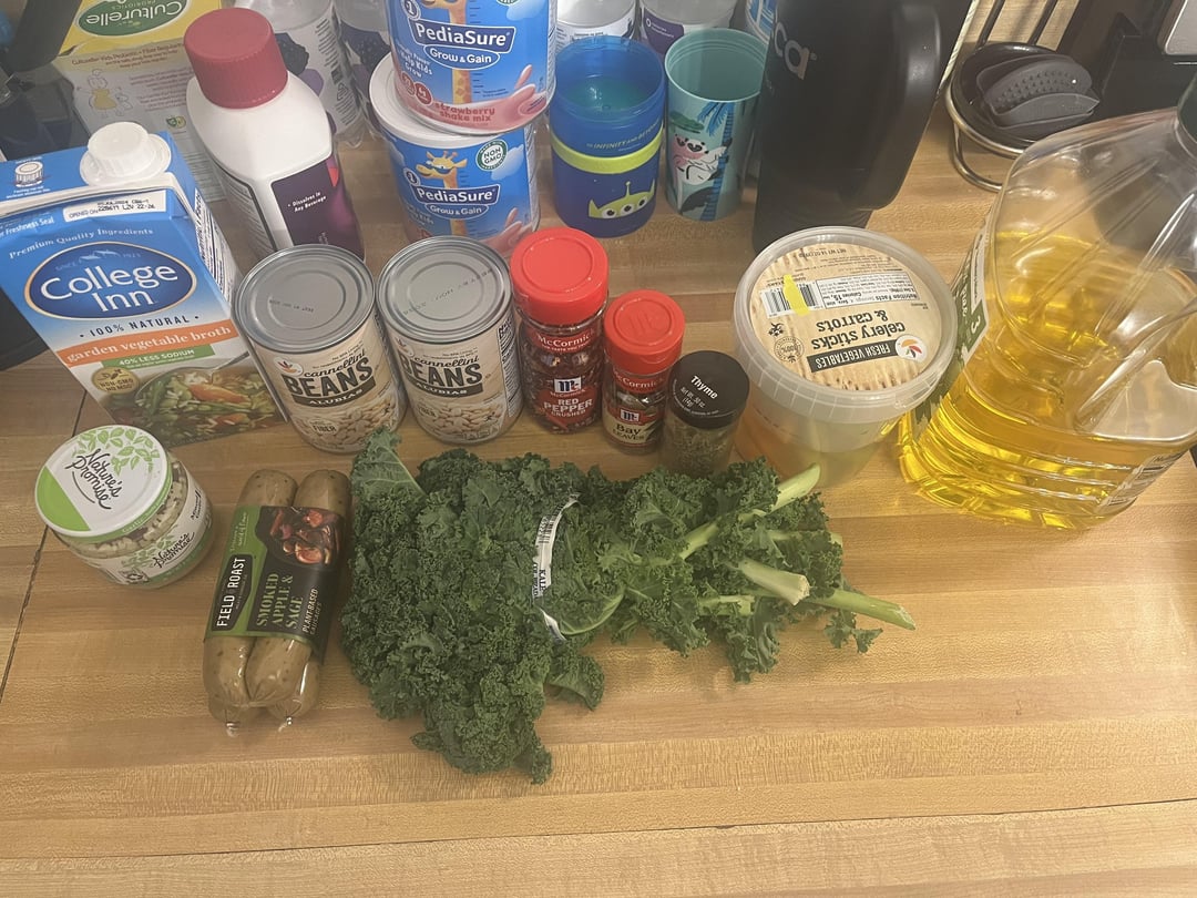 • 4 plant based sausages • 1 bunch Kale • 2 cans white (cannellini) beans • 4 cups vegetable broth • 2 celery stalks (chopped) • 2 carrots (chopped) • 2 cloves minced garlic • 1 teaspoon thyme • 0.5 teaspoon red pepper flakes • 3 bay leaves • salt and pepper to taste