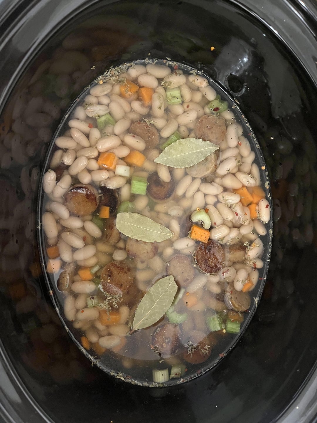 2. Add sausage, beans, broth, spices, carrots, and celery to crock pot. Place 3 bay leaves on top.
