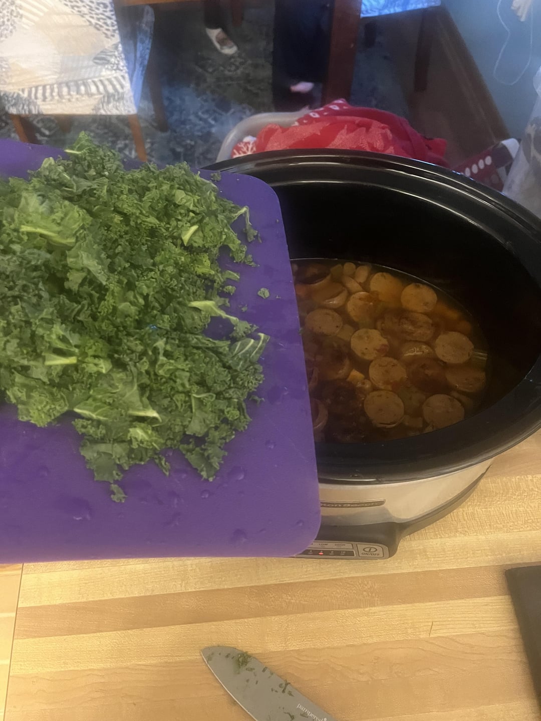 4. After 8 hours, stir in chopped Kale. Cook another 15-30 minutes until Kale wilted. Serve!