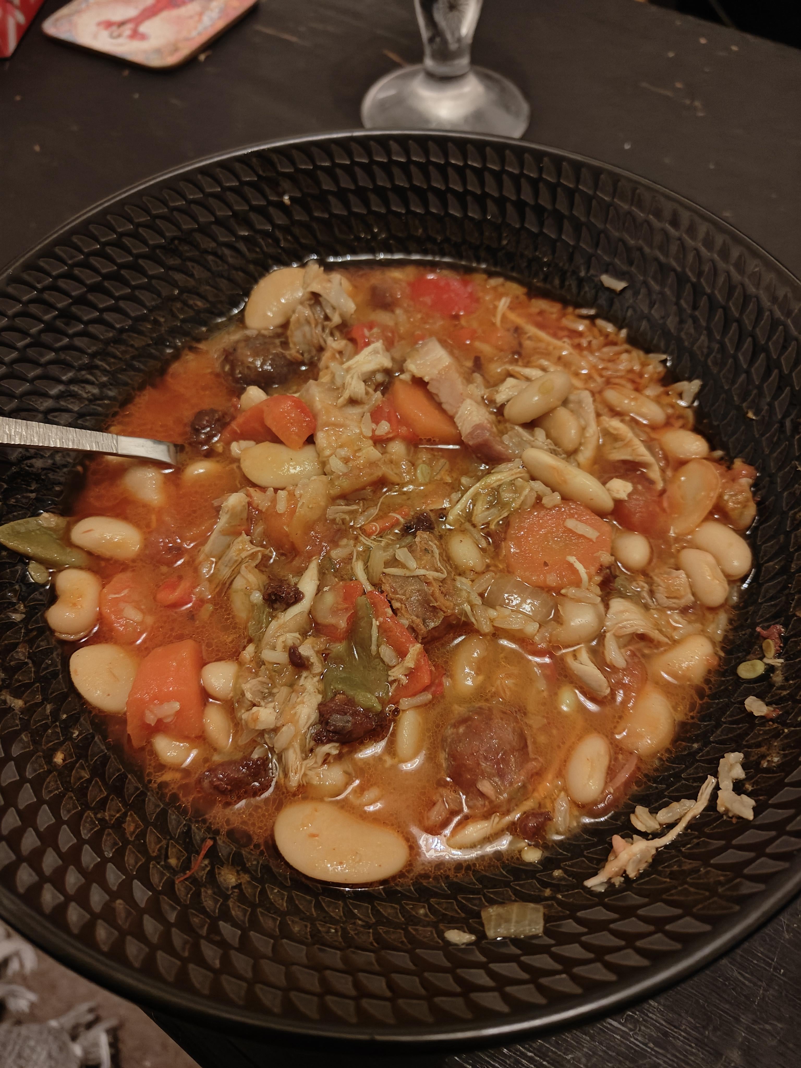 I added skinless chicken thighs (which is not traditional from the recipe) and lowered the fatty meats amount to lower the fat content in it. I also added a pinch of saffron but this is not from the original recipe either.