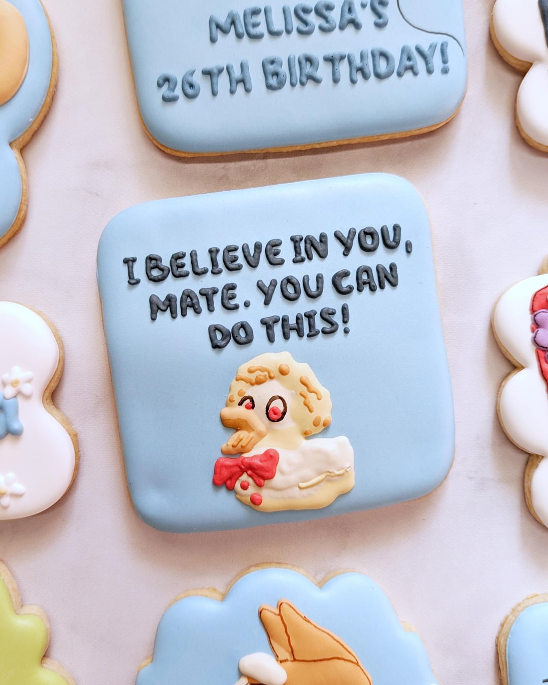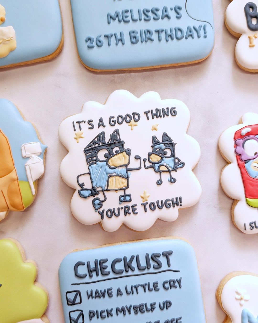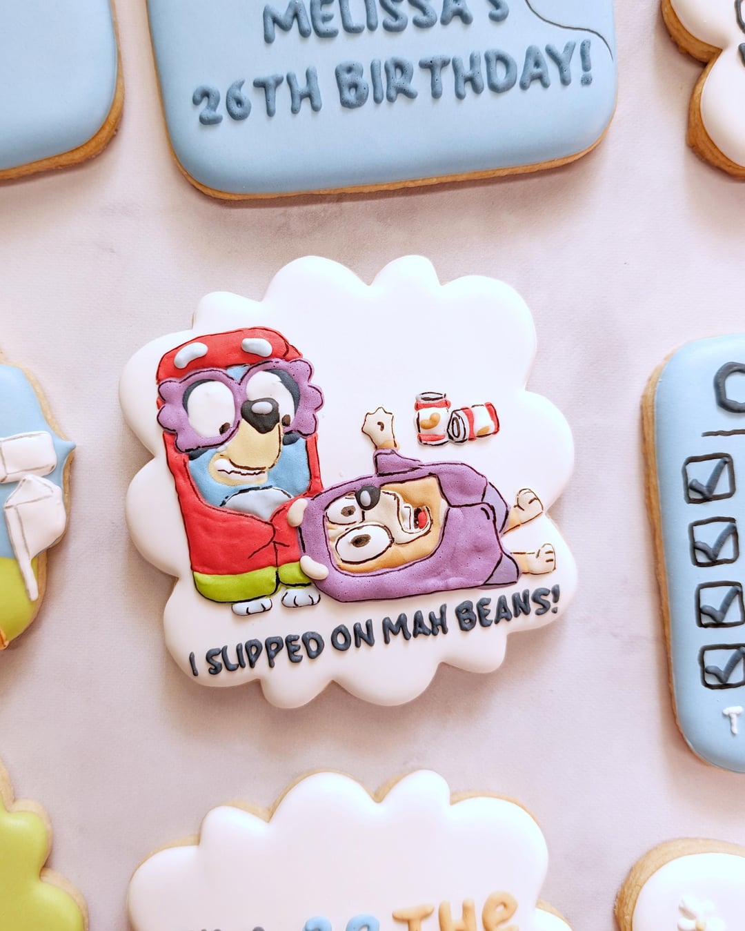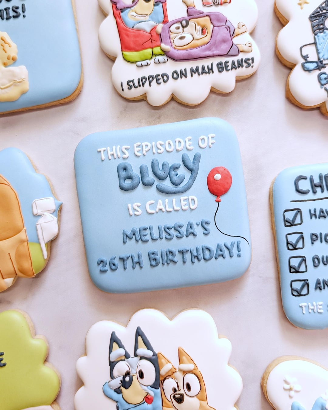 By far my favorite out of the batch is the one says “this episode of Bluey is called Melissa’s 26th Birthday” also I know of particular someone that would absolutely LOVE these cookies. Hint: No, I’m talking about me. Also happy birthday! Hope your day is filled with nothing but love, laughter, friends, family and of course…….MORE BLUEY COOKIES!!!!!! 😂