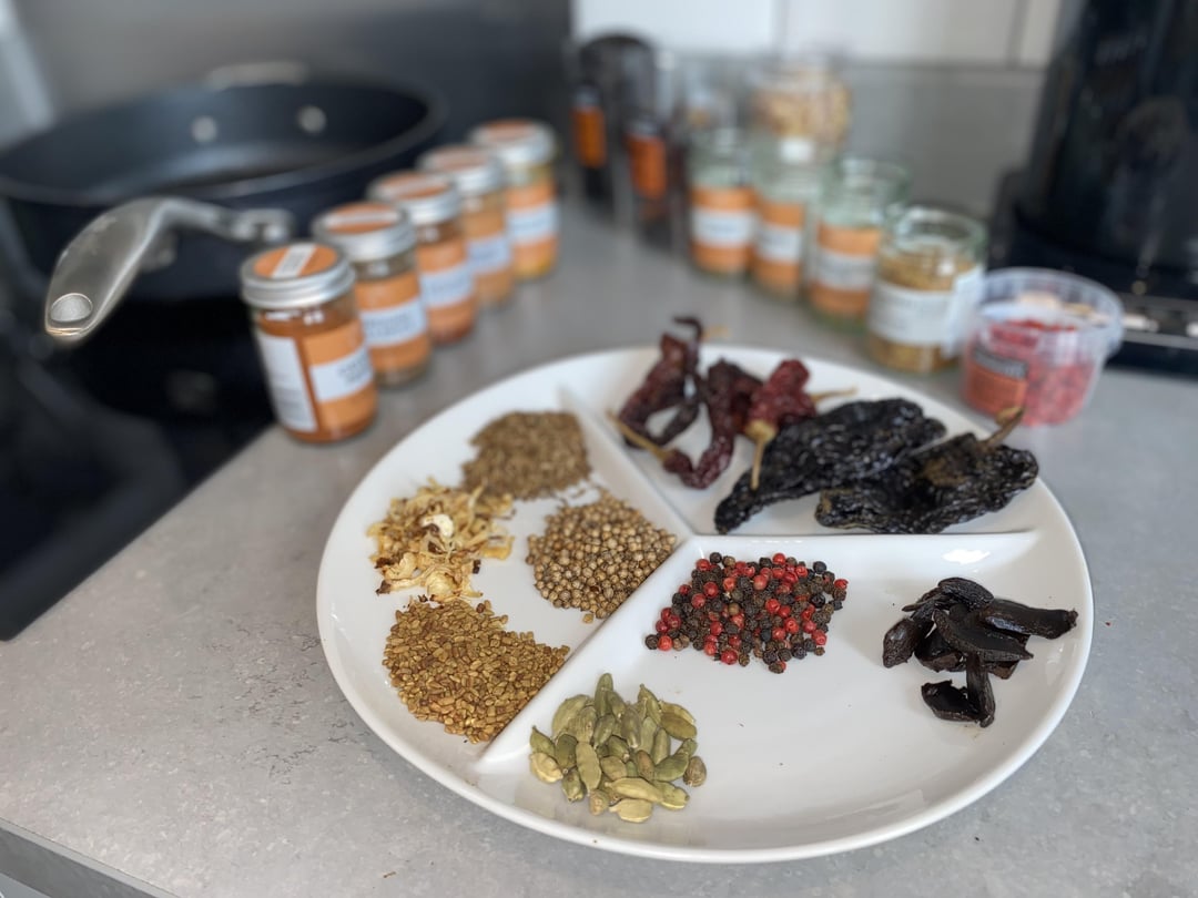 1. Toast the chillies and whole spices in a hot, dry pan until fragrant.