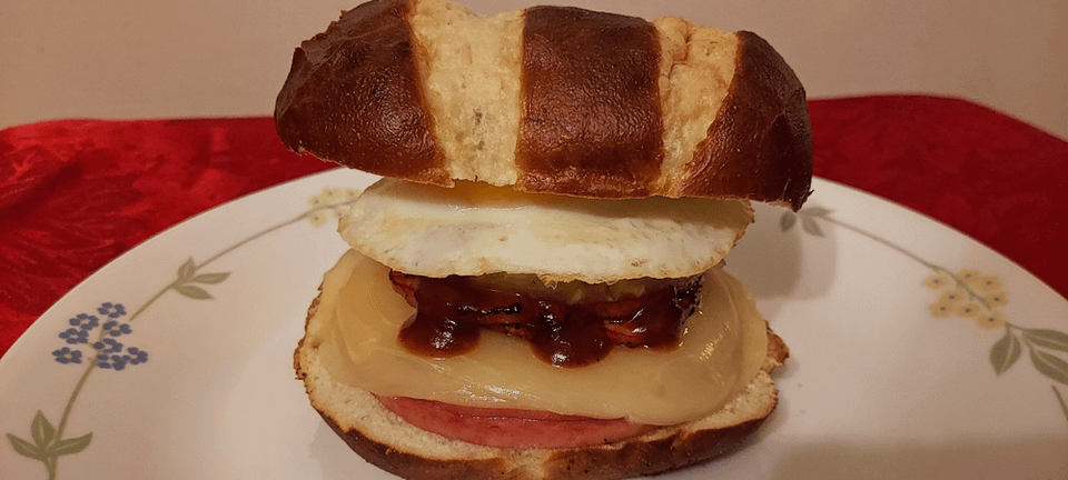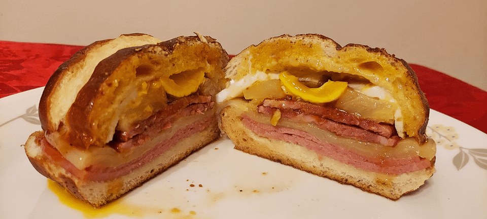Pork roll, provolone cheese, Canadian ham, Sweet Baby Ray’s Sweet Vidalia Onion BBQ sauce, pineapple slice, and an egg on a toasted pretzel bun. by toneman238 2 Comments LightningSack 2 years ago This looks good but the egg bbq pineapple sounds heinous honestly wqssareuy 2 years ago Pineapple & Taylor ham actually sounds really good together. Gonna have to try it.Write A CommentYou must be logged in to post a comment.