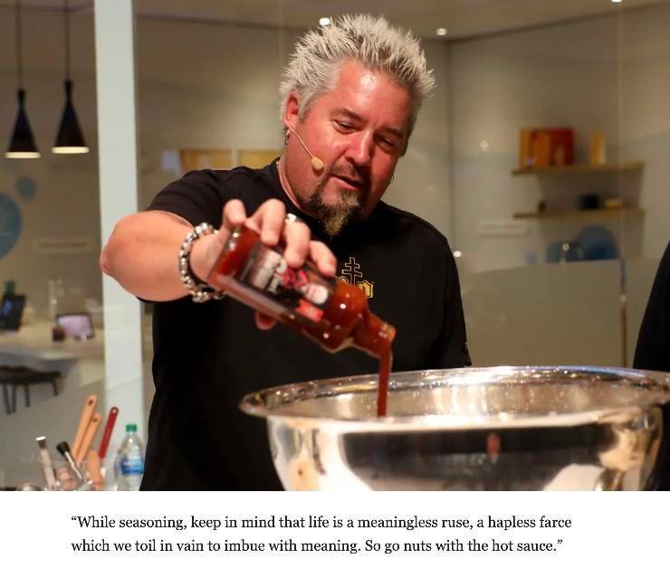 Life is meant to be spicy by Salmiakki_Aficionado 7 Comments cackalackattack 2 years ago ExistentialCrisisTown tequilajinx 2 years ago We went to Flavortown in Pigeon Forge a couple of weeks ago while on vacation. We came down with Covid a few days later and are just getting over it.Guy Fieri tried to kill us. I’m sure of it.Also, I make a better version of his chili than his damn restaurant does.Edit: lol, must have pissed off the Guy Fieri fans. It’s a joke people. SauteePanarchism 2 years ago Make mine absurdistly hot. Wonderful_Painter_14 2 years ago My Guy juju0010 2 years ago Just when I think you couldn’t possibly be any dumber, you go and do something like this… Spirited_Taste4756 2 years ago  ThankuConan 2 years ago The Zen of Flavourtown.Write A CommentYou must be logged in to post a comment.
