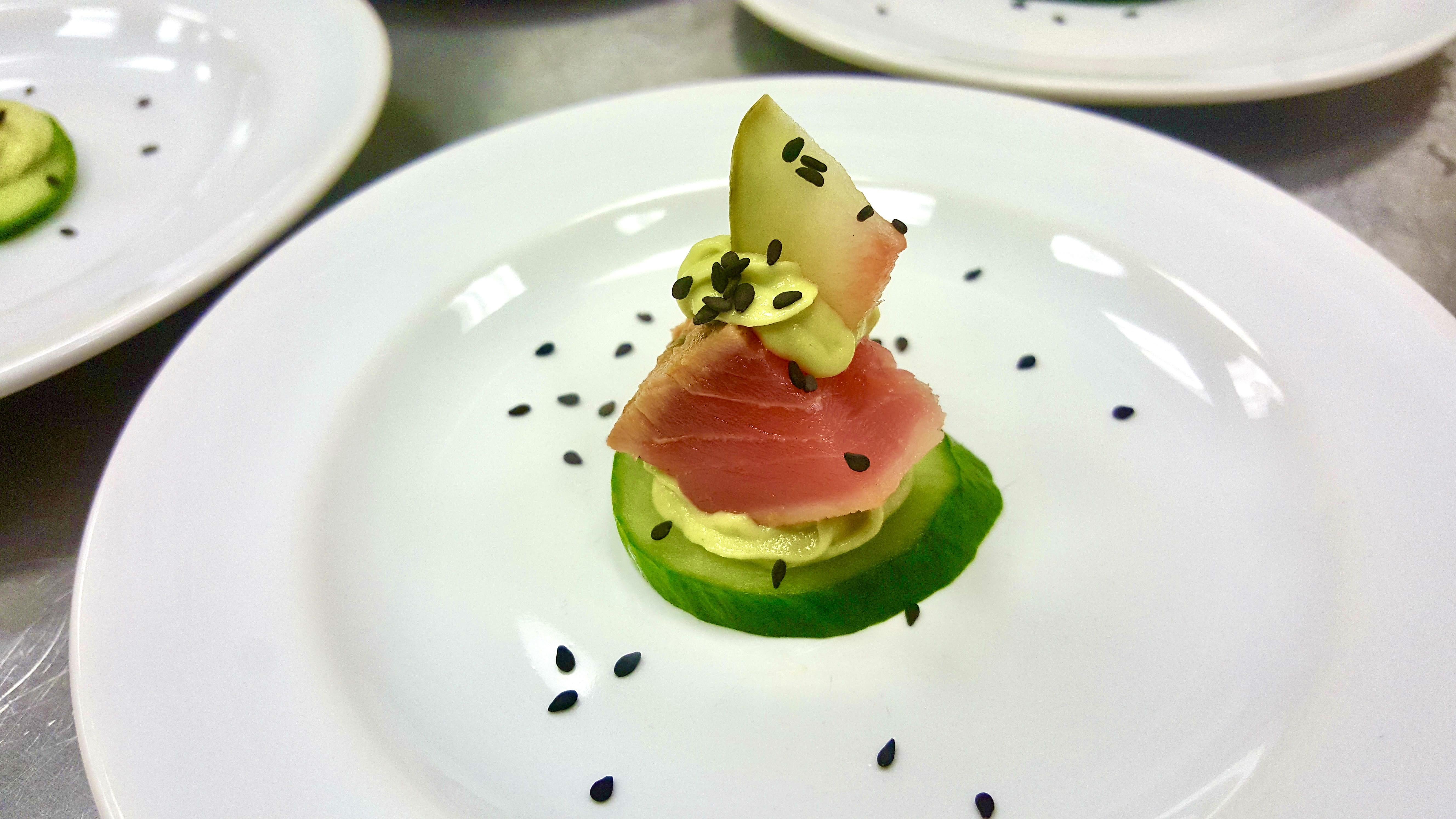 This is an old, small bite dish (like 2017 or 18?), but one I’ve always been aesthetically fond of. Seared tuna, whipped avocado with sesame oil, cucumber, pickled watermelon rind, and toasted black sesame. Snapped super quickly before serving, so not as beautiful a photograph as it could have been. But still, it warms the cockles.