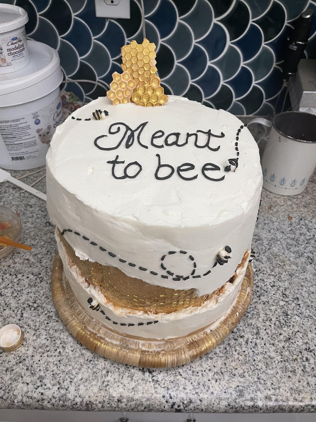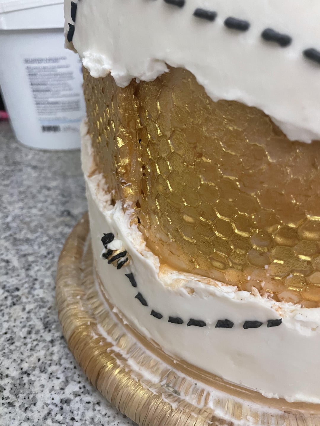 I was asked to make a cake for my future sister and brother-in-law’s “meant to bee” themed wedding shower. I learned about fault line cakes and decided to give a go at it, using honeycomb as my middle layer. The honeycomb is white chocolate painted gold. It was a lot harder than I thought it would be, and I had a difficult time trying to make the frosting smooth. Many of the examples I saw online were perfectly smooth and I just could not get it to look like that. If I pressed too hard, the frosting would start to pull off the honeycomb. I was using buttercream frosting. It was also 84 degrees in the house so Im not sure if that also contributed to my issues. Any tips?